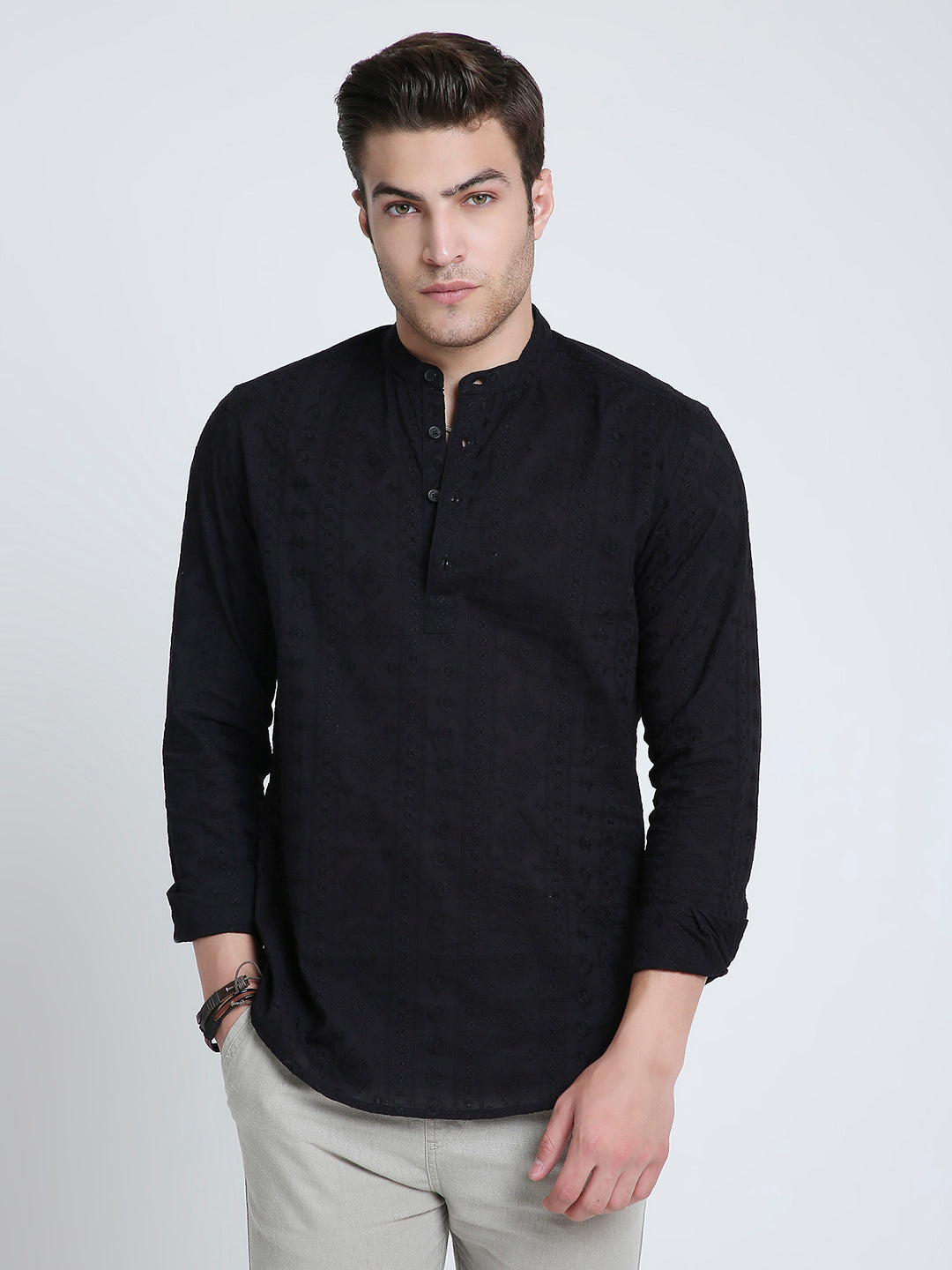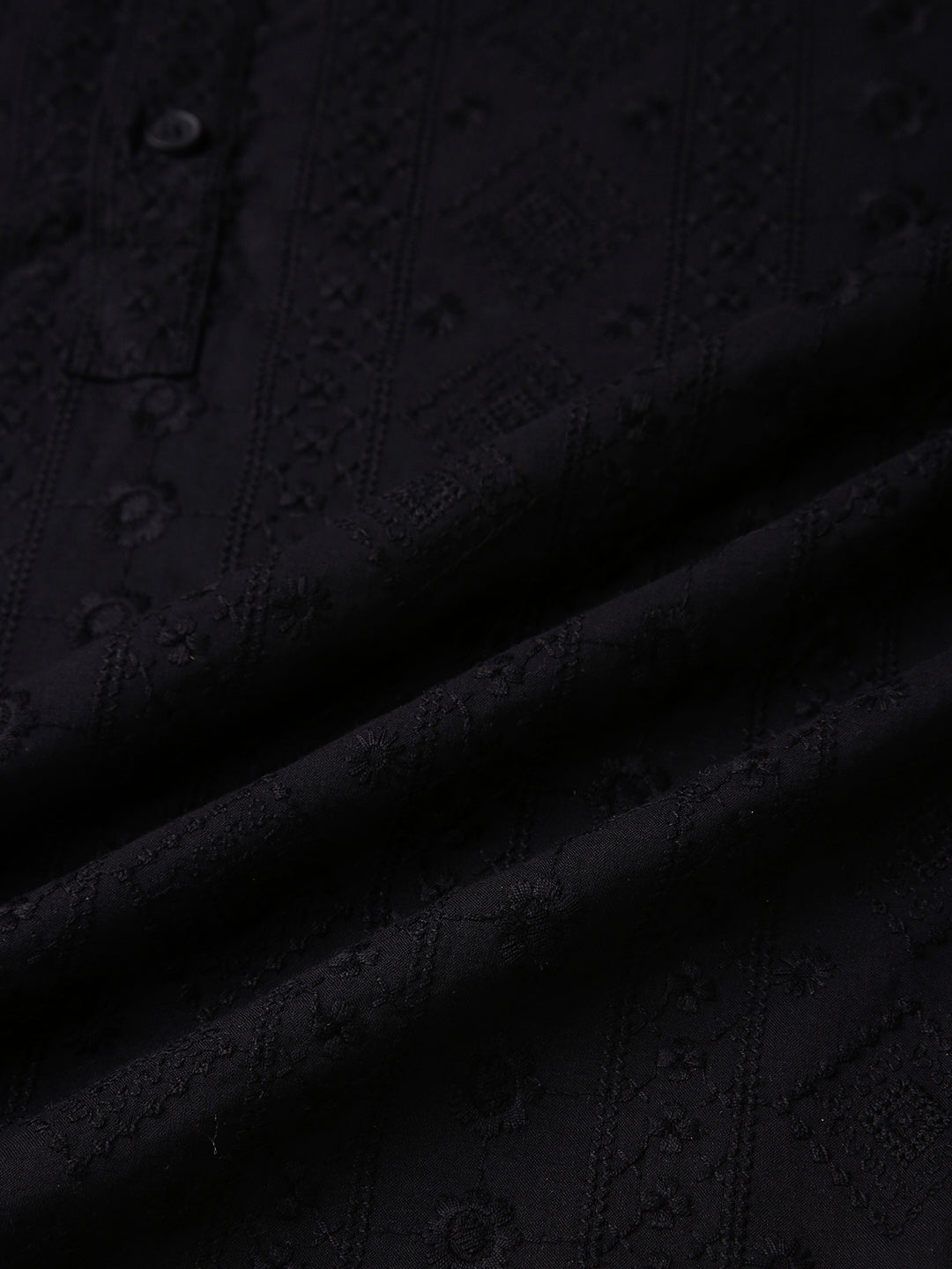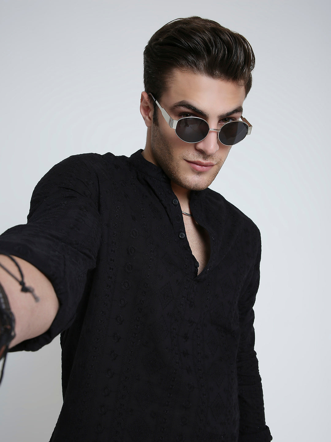 Elevate your ethnic style with this Classic Blackout Embroidered Kurta. Adorned with intricate embroidery, this piece blends understated elegance with artisanal charm. The rich black tone adds timeless sophistication, making it a perfect choice for celebrations, formal events, or elegant casual wear. Soft, breathable fabric ensures lasting comfort while keeping your look refined.