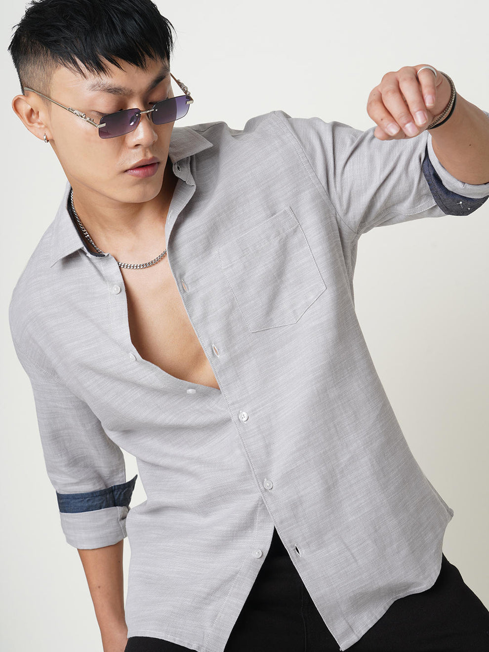 This classic grey shirt adds a touch of texture and sophistication, transforming a casual staple into a style statement. Dress it up with tailored trousers and a blazer for a polished look or keep it casual with rolled sleeves and chinos for weekend adventures. This cotton shirt is a wardrobe essential that transitions seamlessly from work to play. Invest in comfort and style that never goes out of fashion.