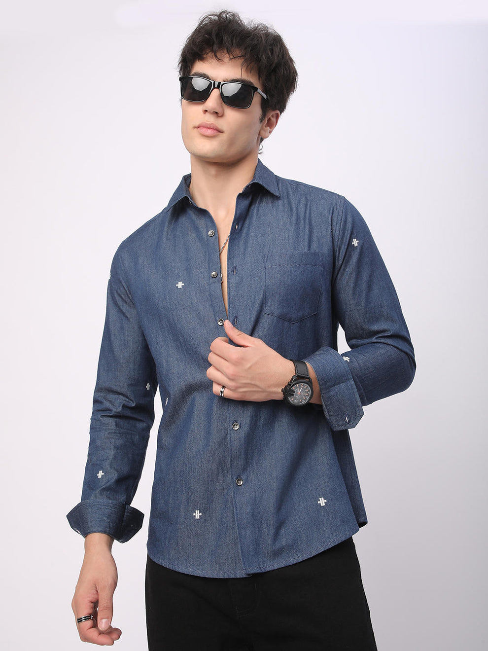 Classic with a Twist: Experience timeless style with our denim shirt by VASTRADO. Crafted from pure cotton, this slim-fit shirt offers exceptional comfort and a sophisticated look. The subtle texture adds depth and visual interest, while the minimal embroidery provides a refined touch. Perfect for both casual and smart casual occasions, this versatile piece is a wardrobe essential.