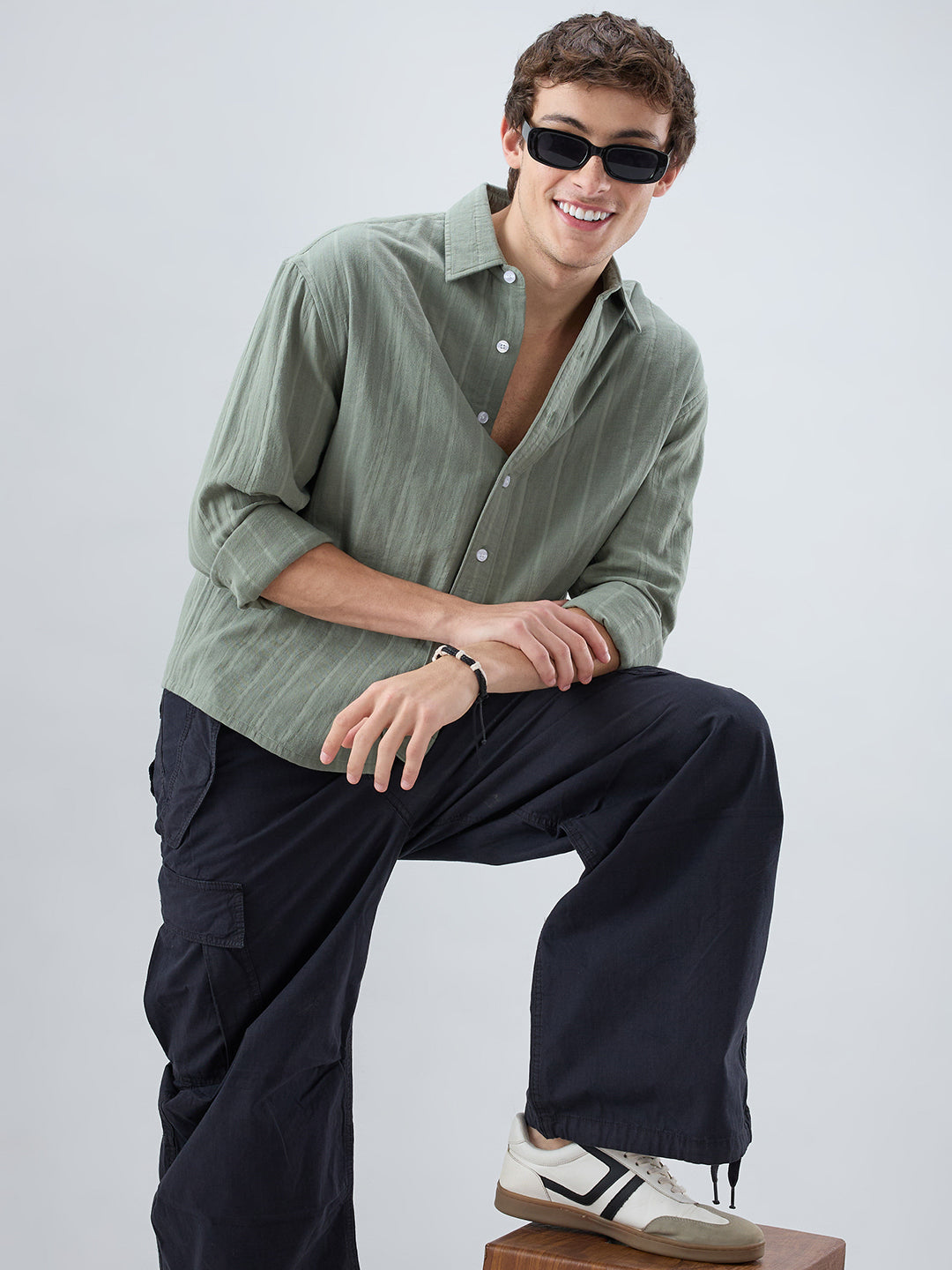 Elevate your style with this forest green double cloth striped boxy fit crop shirt, crafted for a soft feel and relaxed silhouette. The cropped length and subtle stripes make it a versatile piece, perfect for pairing with our trousers for a modern look.