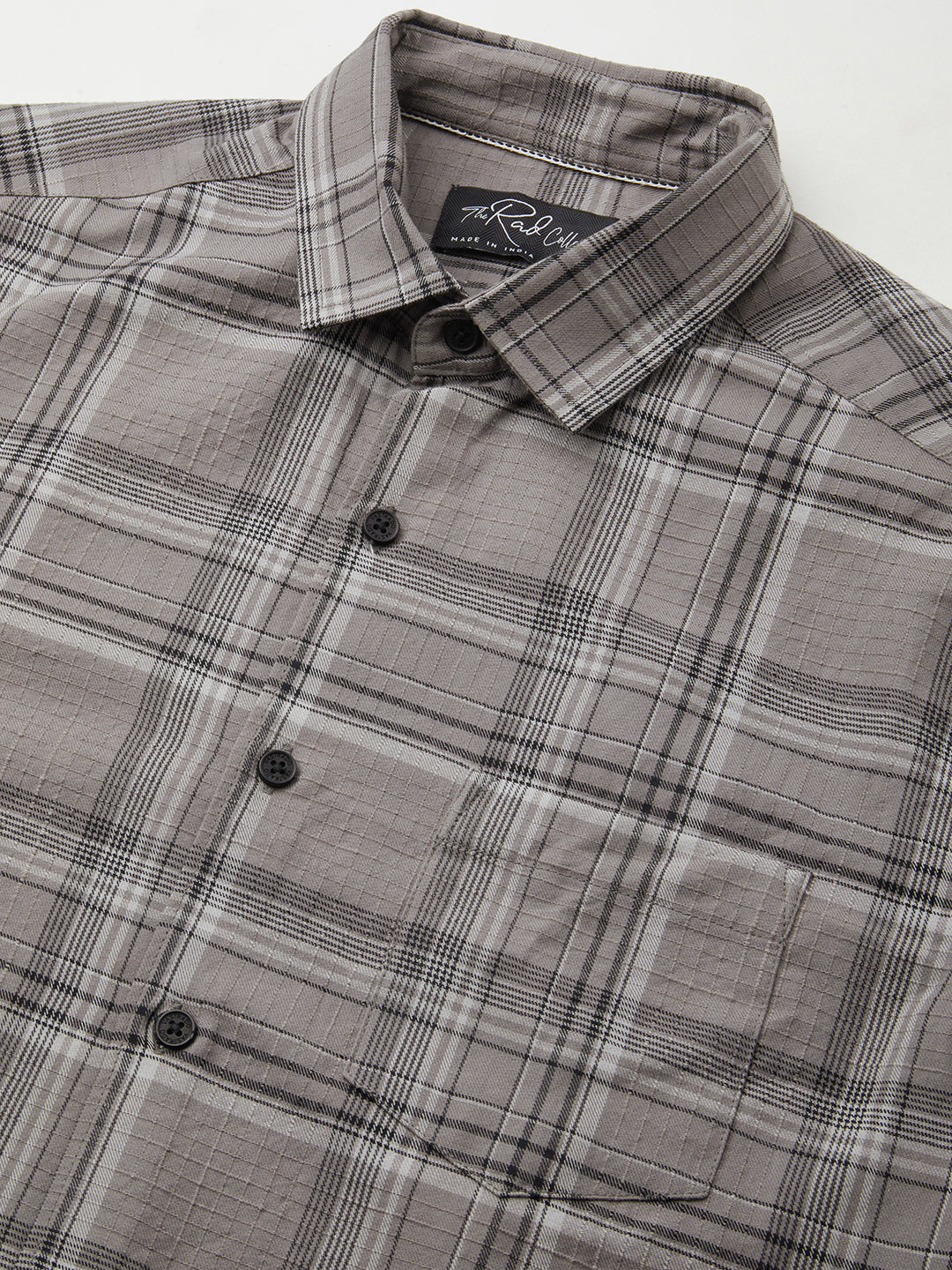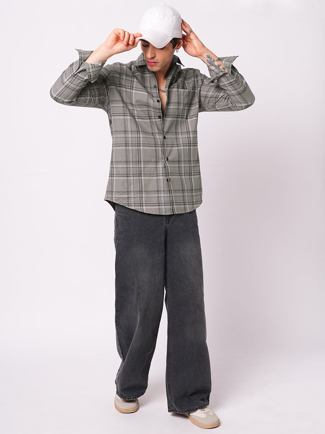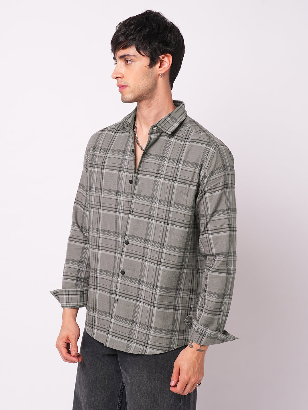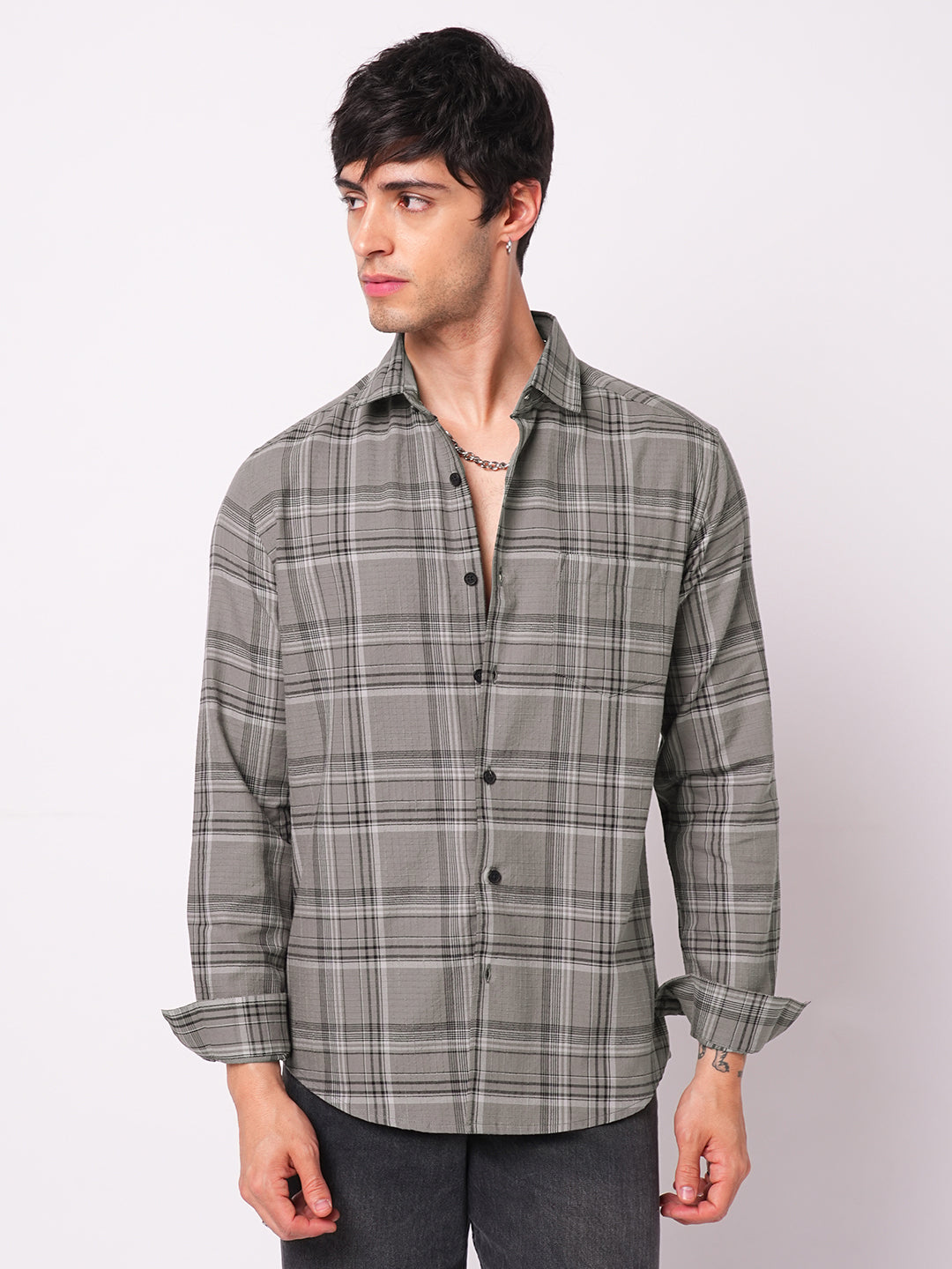 This stylish grey shirt features a refined checkered pattern with bold black lines, creating a sharp and modern look. The subtle texture of the fabric adds depth, making it a great choice for both casual and semi-formal settings. The black buttons contrast nicely against the grey base, enhancing its sleek design. With a structured collar and neatly stitched details, this shirt offers a polished yet comfortable fit. Whether paired with jeans for a relaxed vibe or dressed up with slacks for a professional touch, this versatile piece is a must-have in any wardrobe.