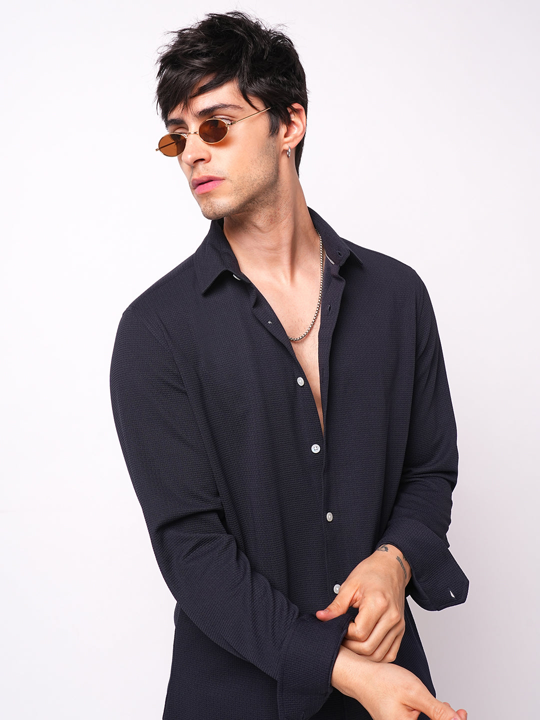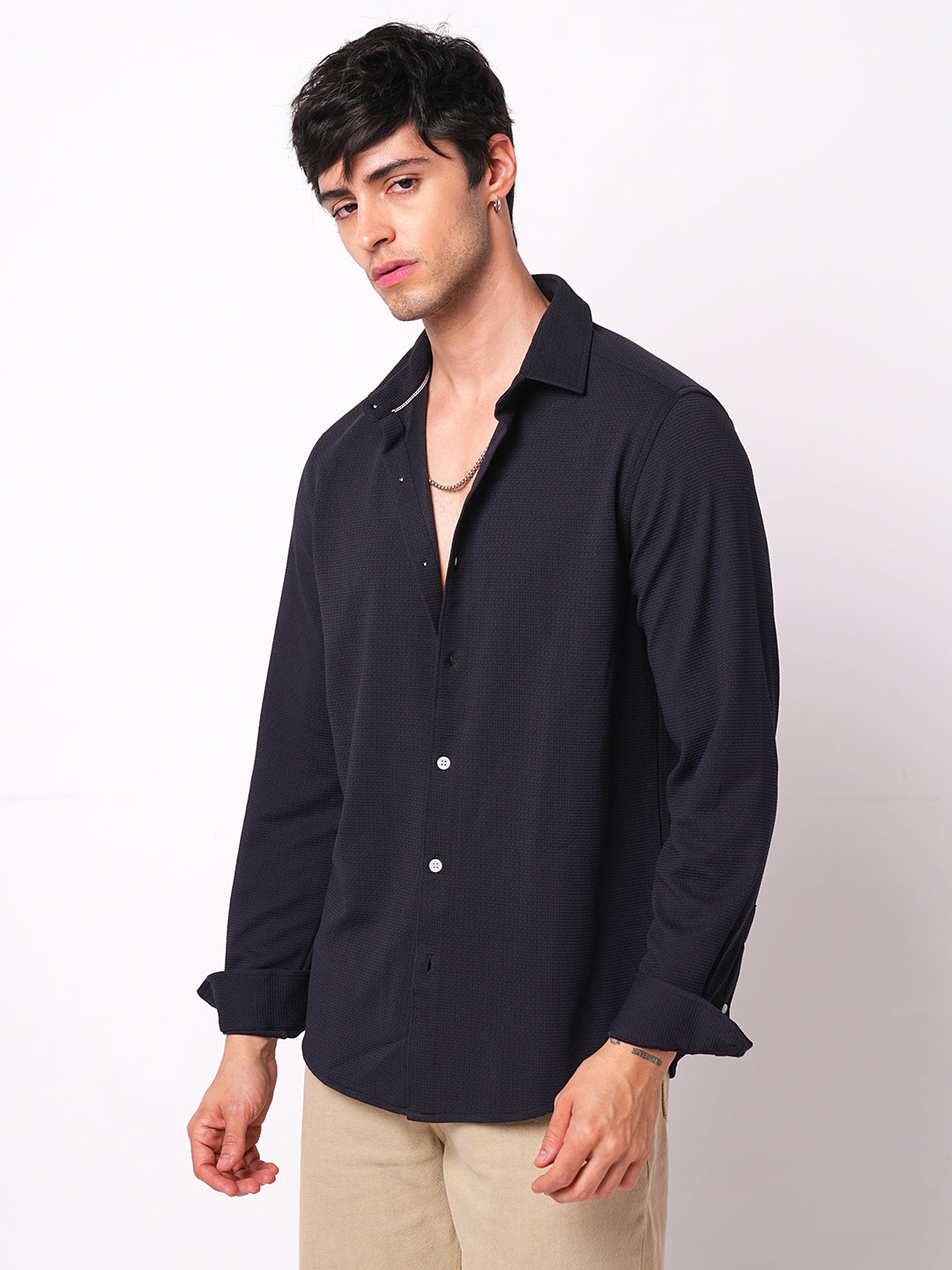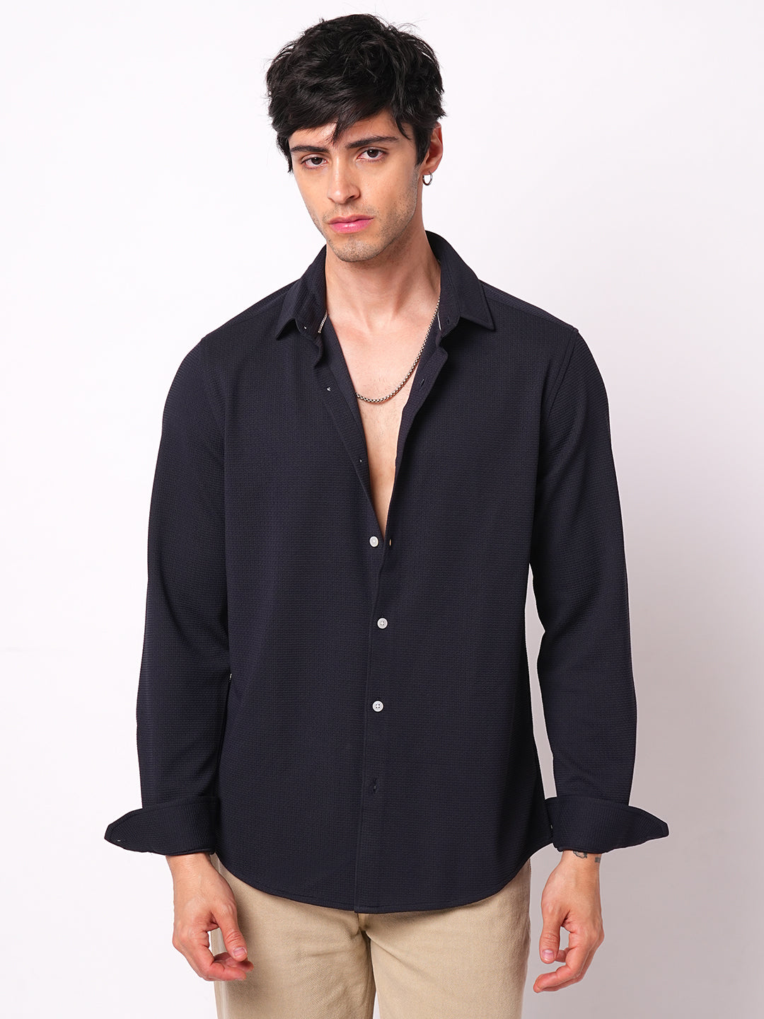 Discover the perfect blend of style and comfort with our meticulously crafted knitted shirt. Featuring a waffle design, regular collar, and full sleeves, this shirt redefines traditional fashion norms. Made from high-quality polyester fabric, it offers a slim fit that flatters all body types. Ideal for both casual and formal occasions, this shirt is a must-have addition to your wardrobe. Elevate your sartorial excellence today!