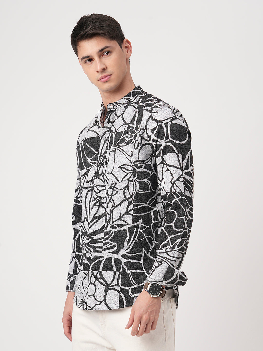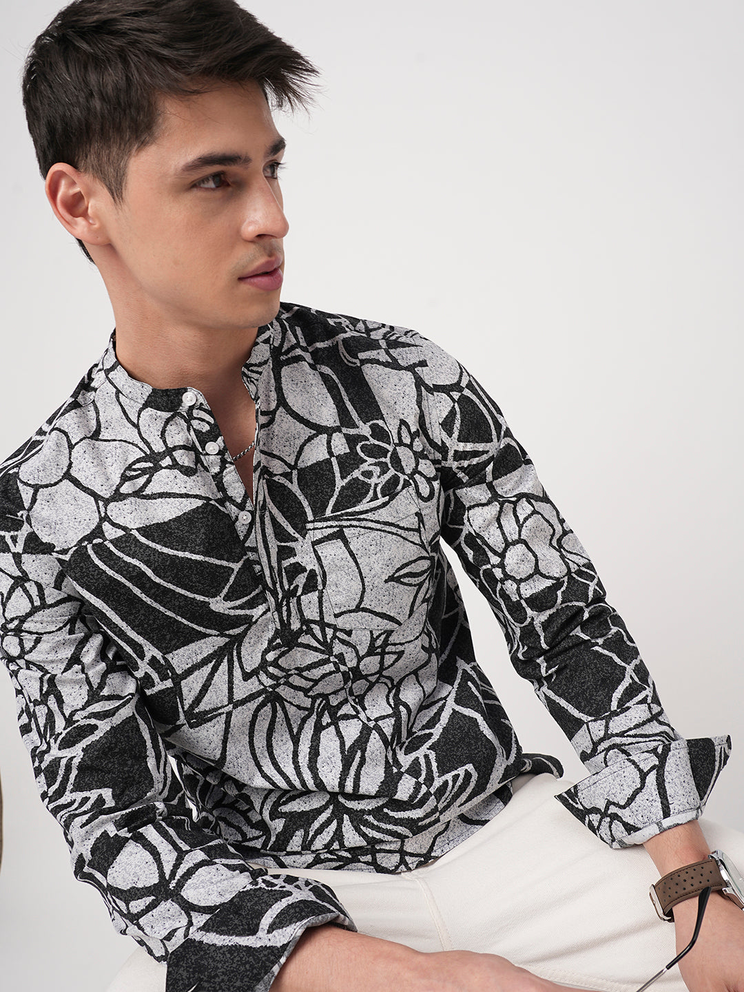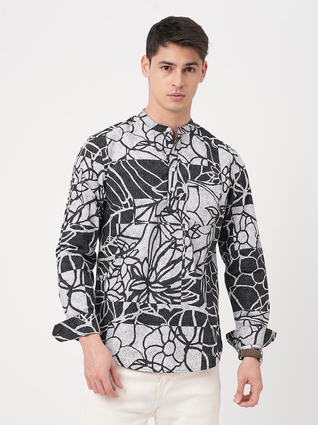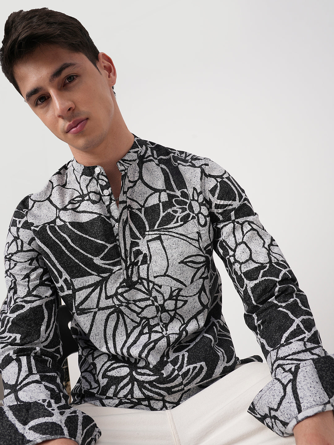 Make a bold statement with this Obsidian Black Abstract Printed Kurta. With its striking abstract print, full sleeves, and sleek mandarin collar, this kurta offers a modern twist on classic style, perfect for those who dare to stand out.