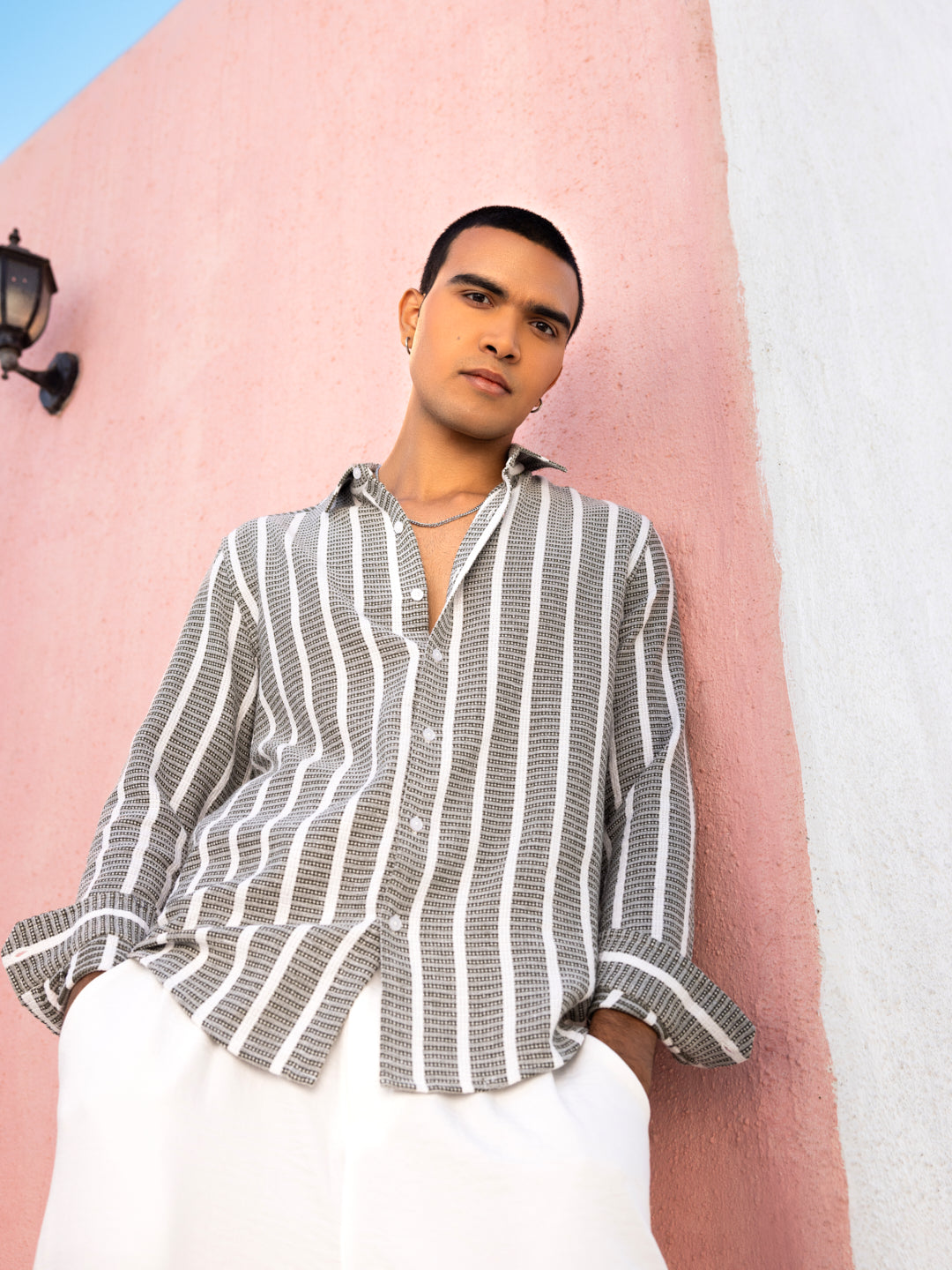 Timeless stripes, effortless style. This Olive & White Dobby Striped Shirt offers a perfect blend of sophistication and comfort. Crafted from breathable cotton with a sharp striped design, it's a versatile wardrobe essential for any occasion.