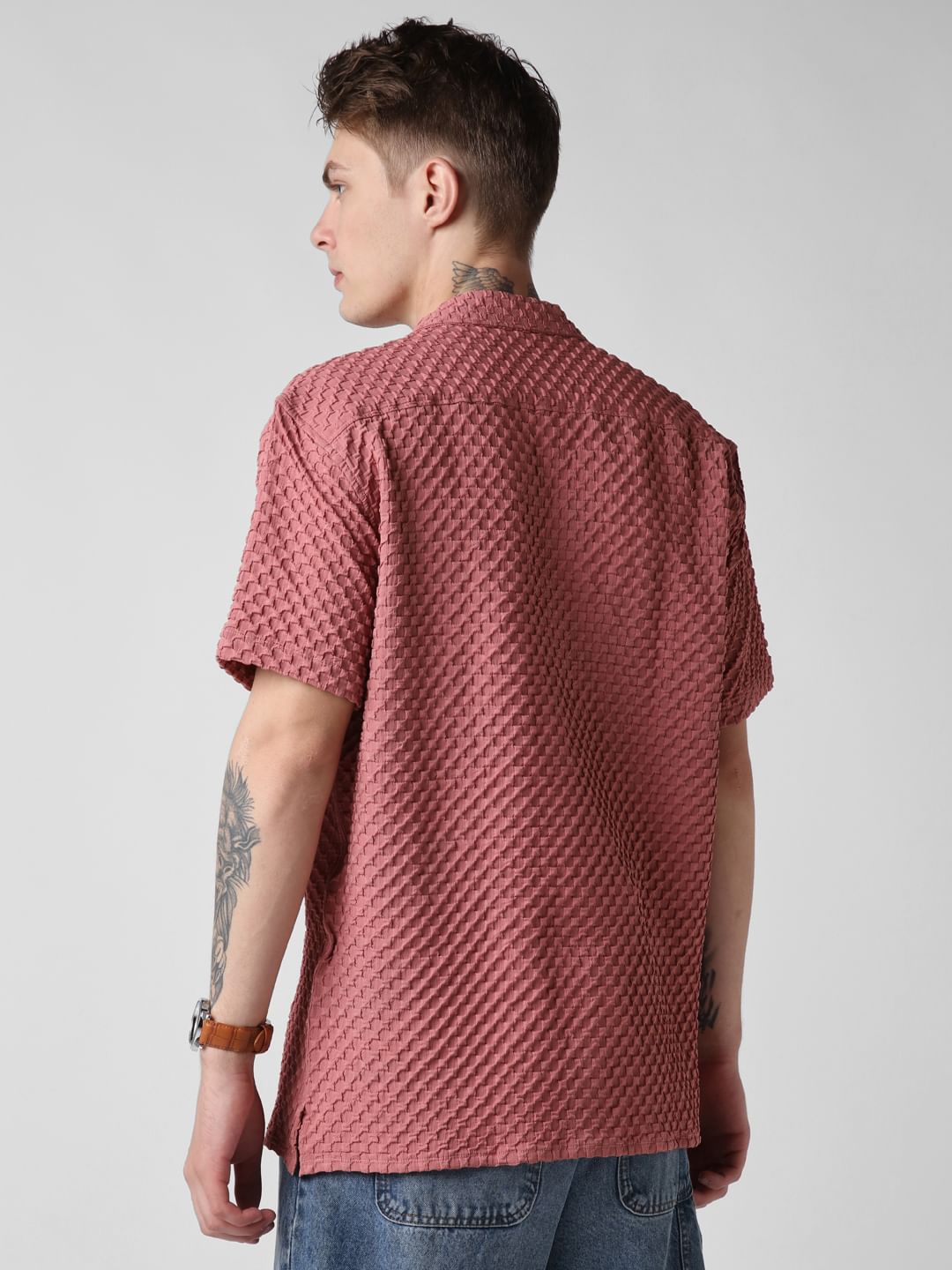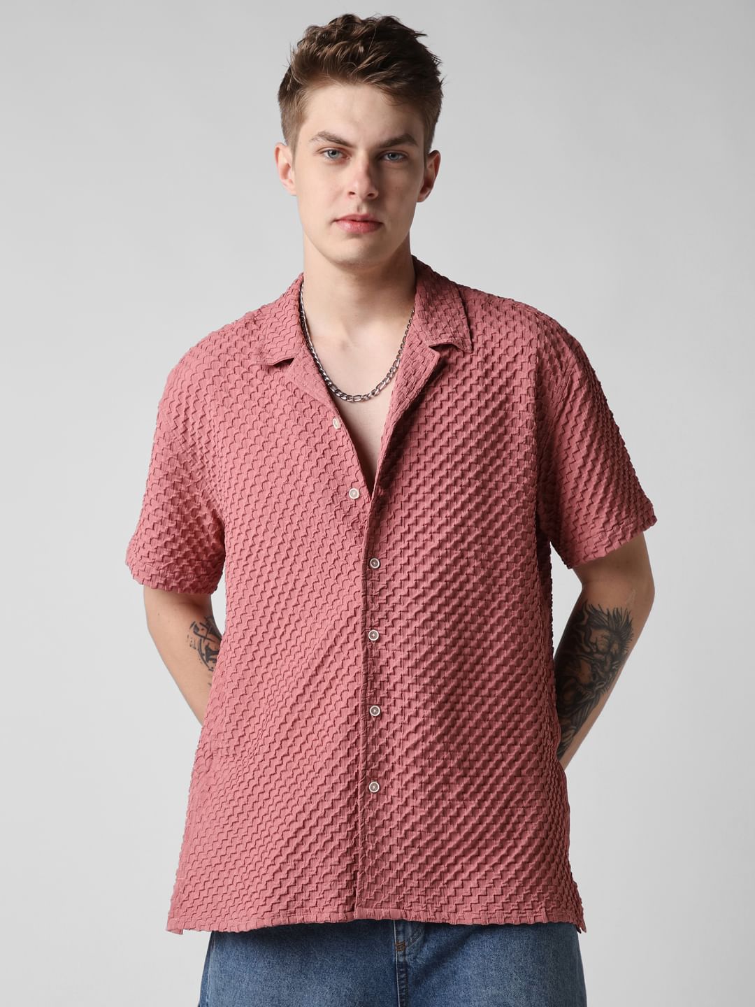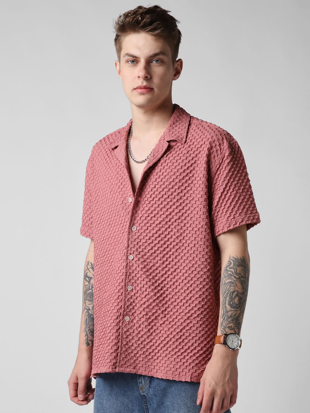 Introducing this Peach Blossom Embossed Patterned Oversized Shirt from VASTRADO a fusion of sophistication and comfort. This shirt features an embossed pattern reminiscent of peach blossoms in bloom. The notch collar and oversized fit offer a contemporary silhouette that exudes laid-back elegance. With half sleeves providing a breezy feel, it's perfect for leisurely strolls or casual gatherings. Elevate your style effortlessly with this versatile piece that seamlessly transitions from day to night.