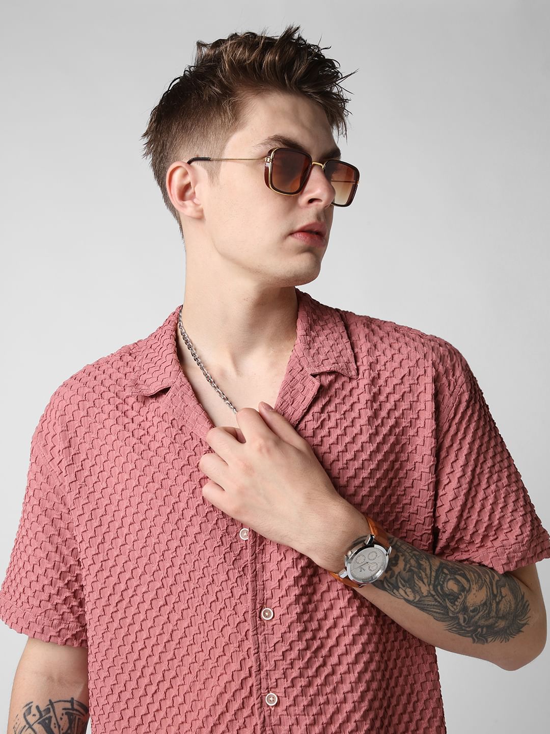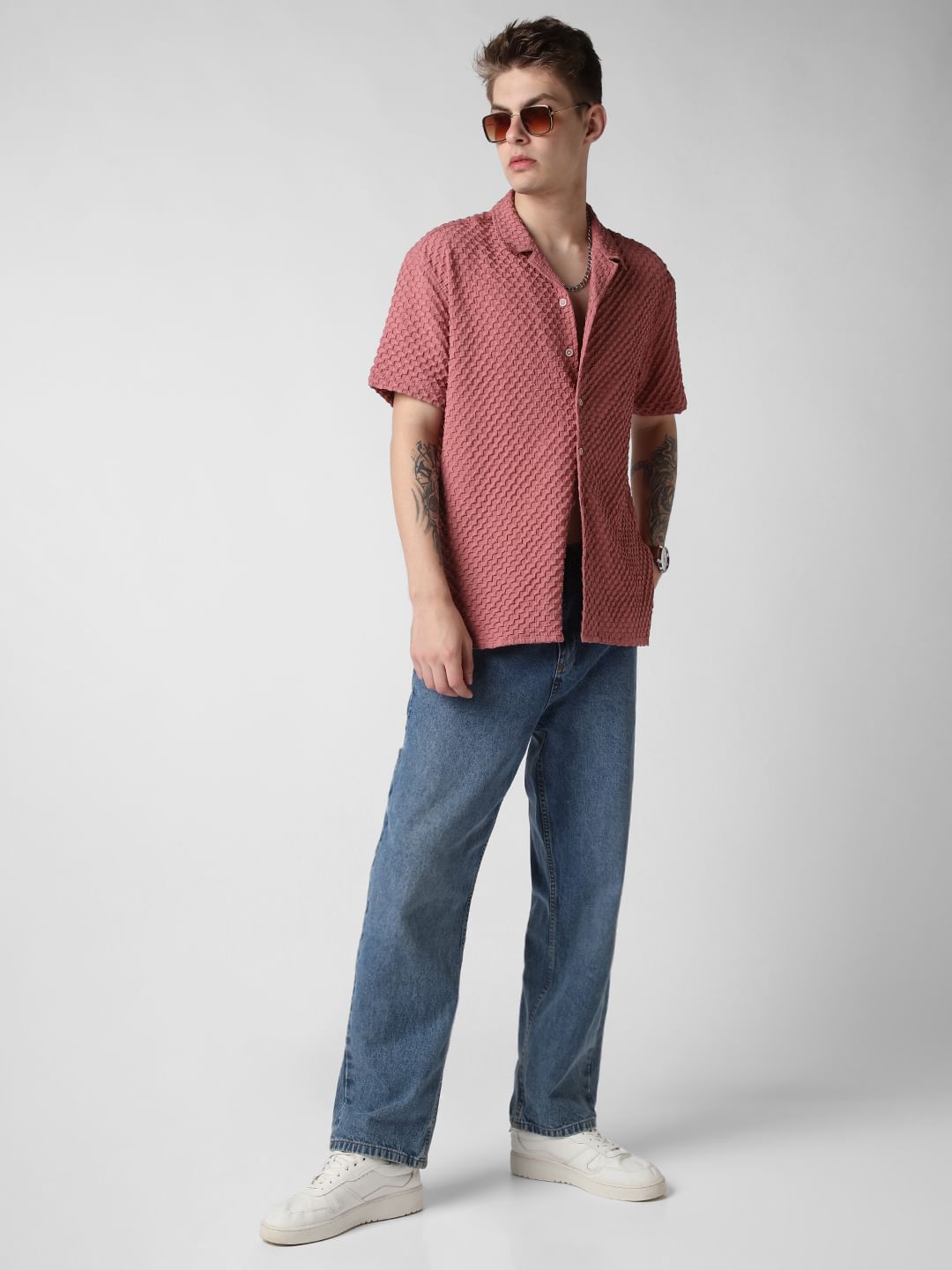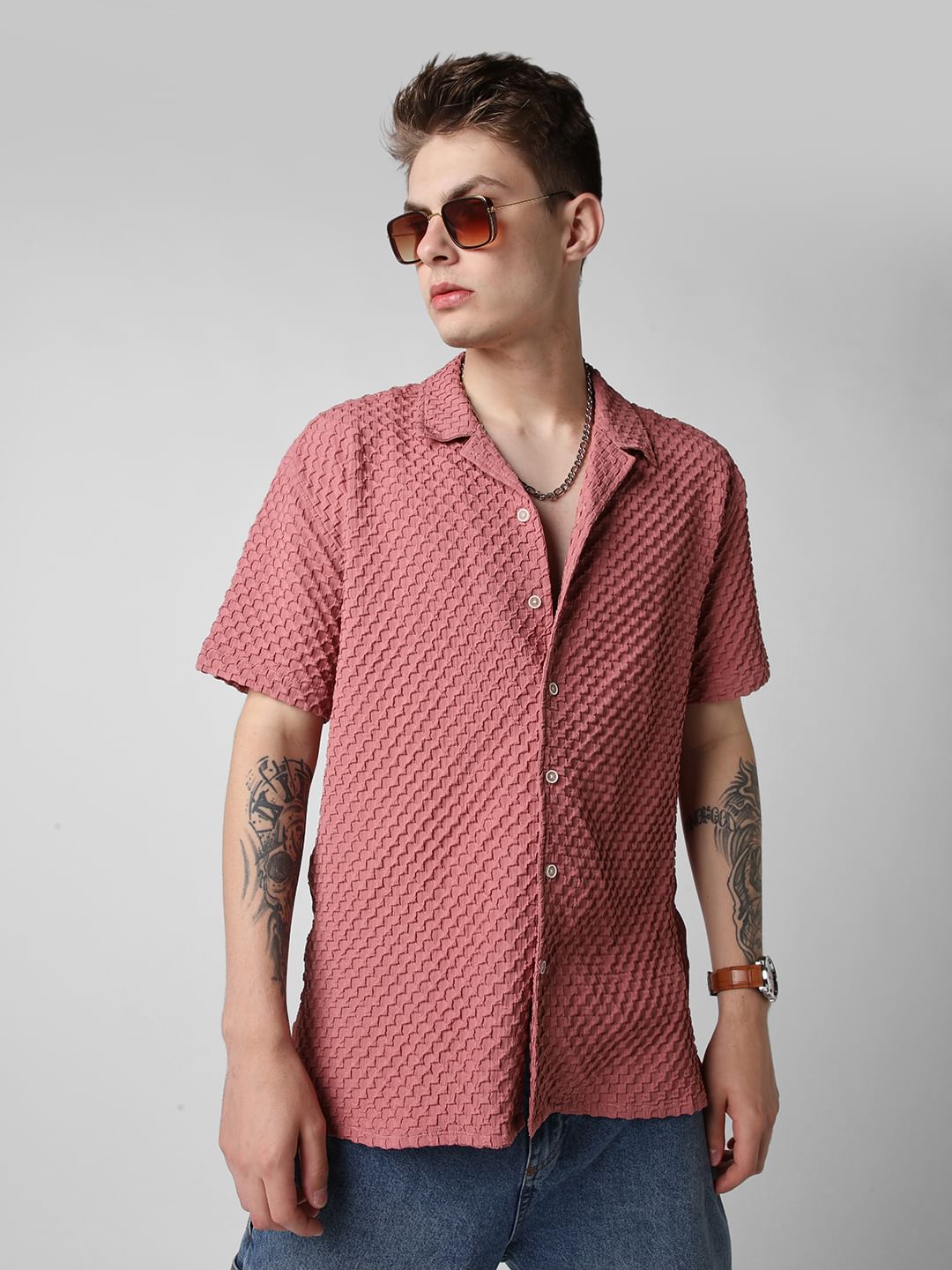 Introducing this Peach Blossom Embossed Patterned Oversized Shirt from VASTRADO a fusion of sophistication and comfort. This shirt features an embossed pattern reminiscent of peach blossoms in bloom. The notch collar and oversized fit offer a contemporary silhouette that exudes laid-back elegance. With half sleeves providing a breezy feel, it's perfect for leisurely strolls or casual gatherings. Elevate your style effortlessly with this versatile piece that seamlessly transitions from day to night.