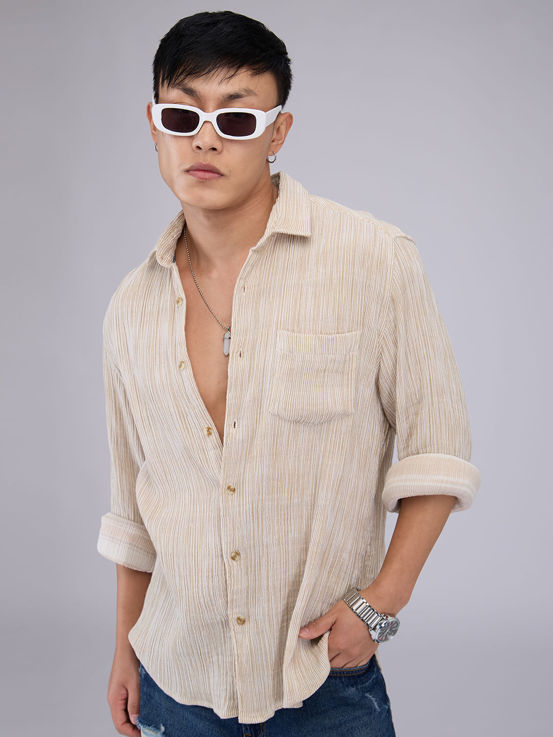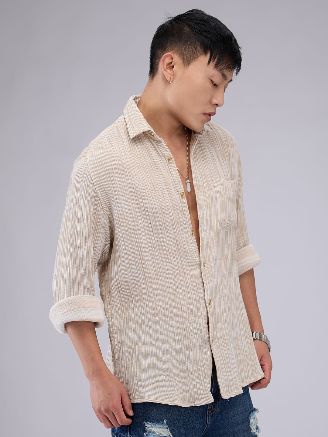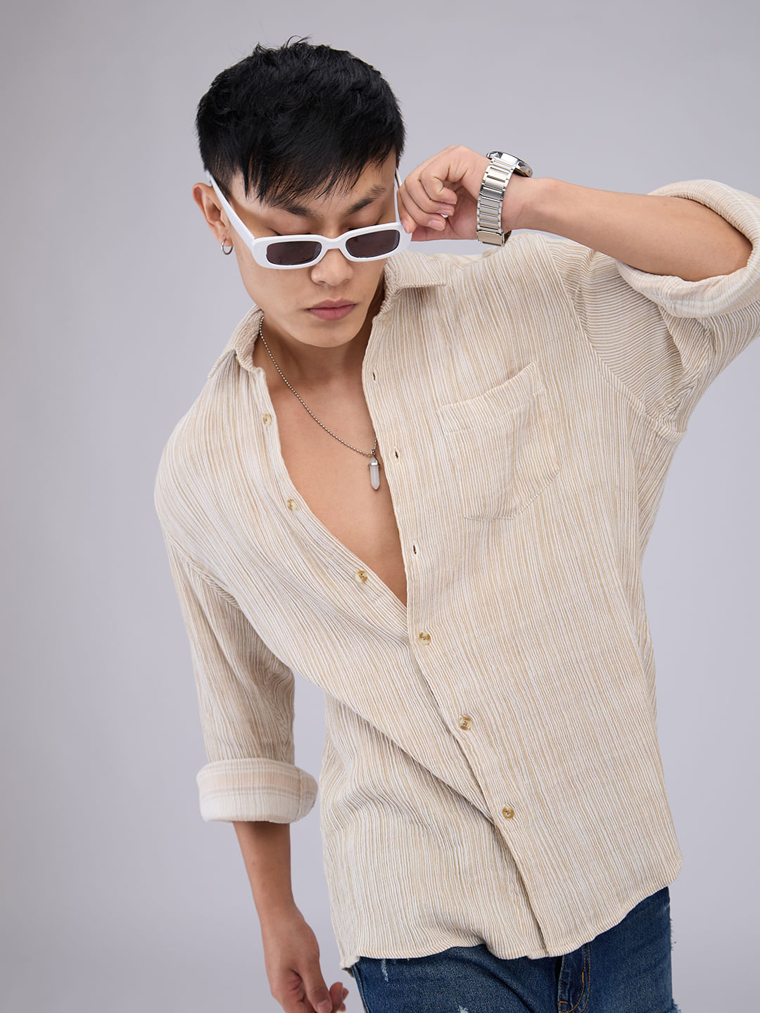 Premium Cotton Beige Double Cloth Line Striped Crepe Shirt