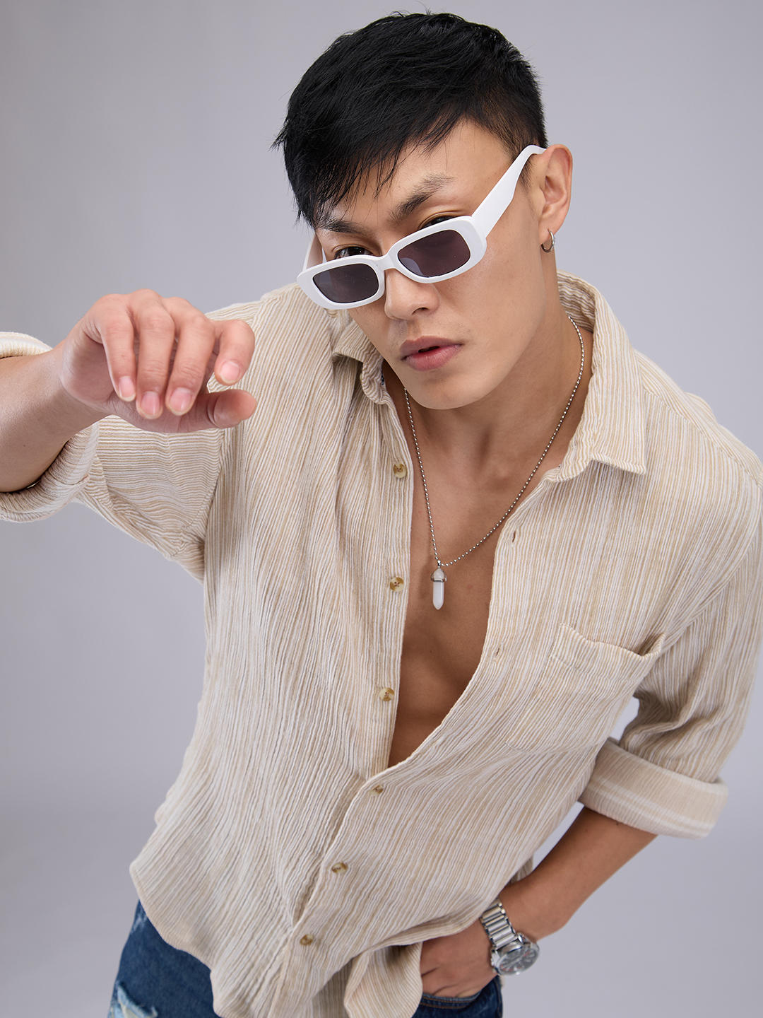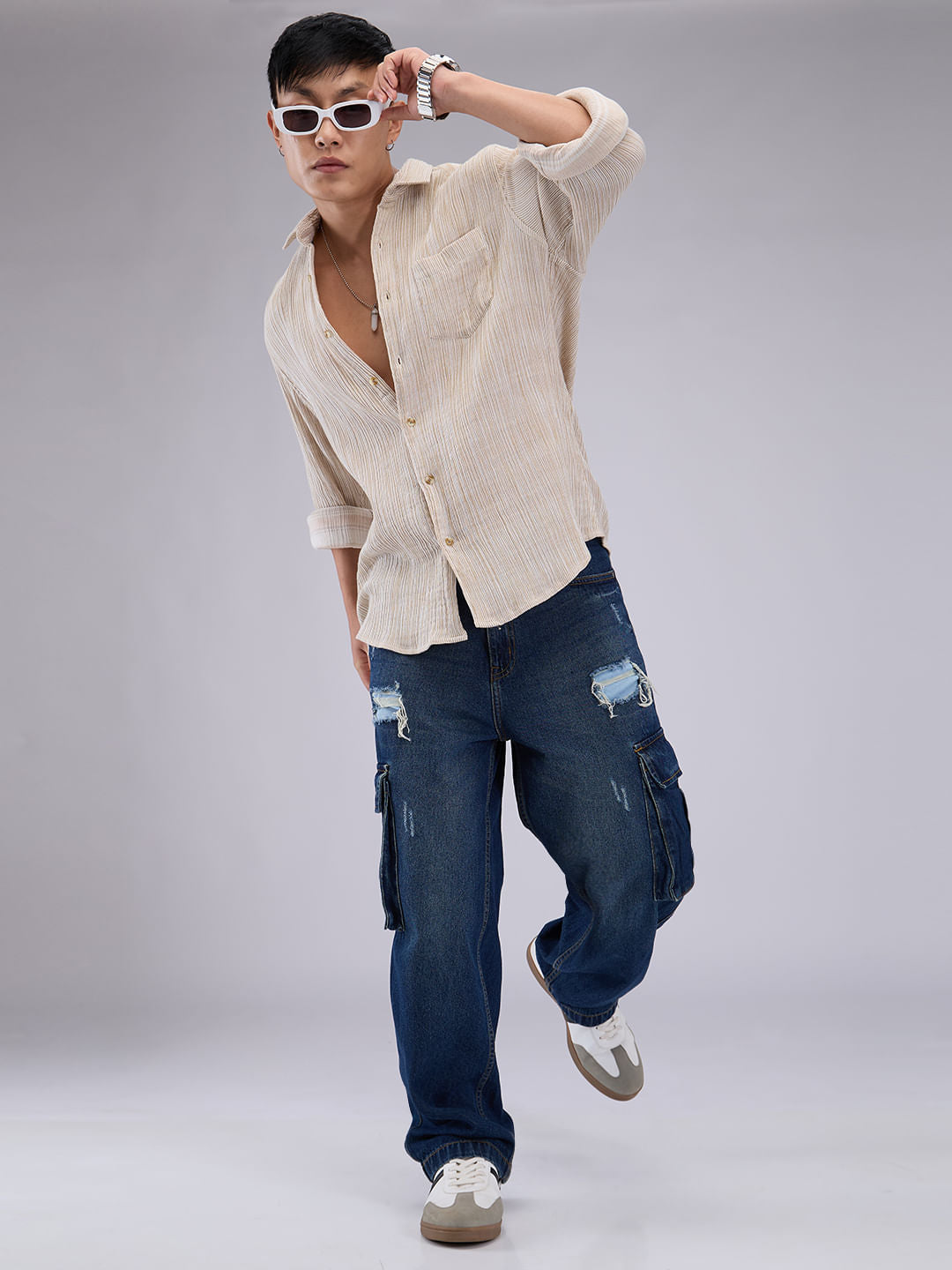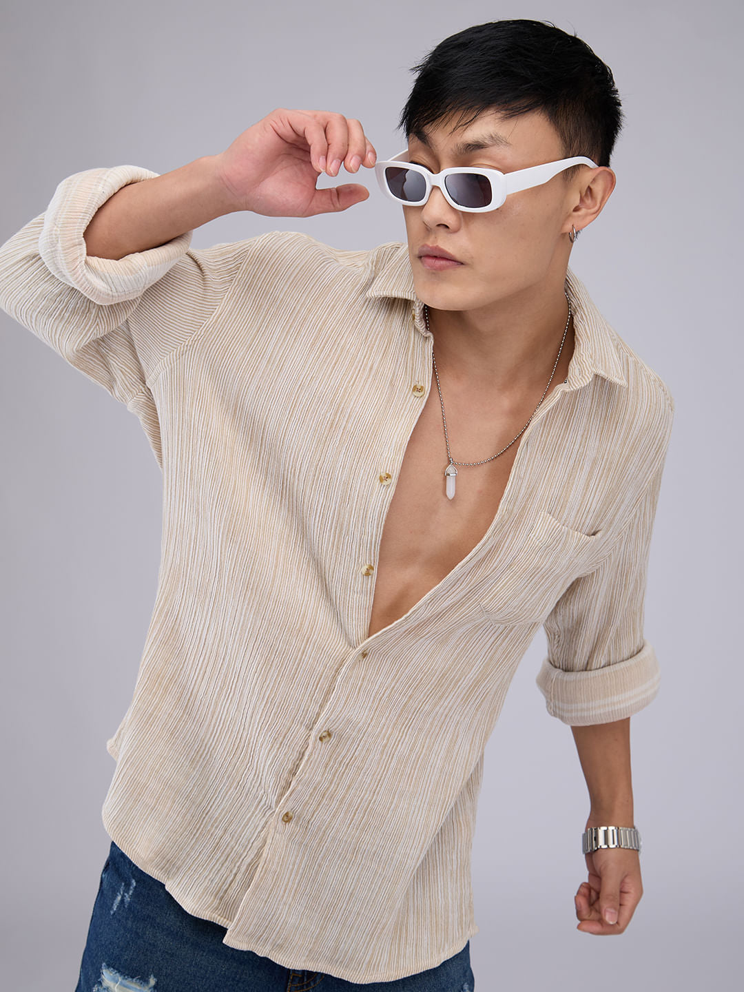 Premium Cotton Beige Double Cloth Line Striped Crepe Shirt