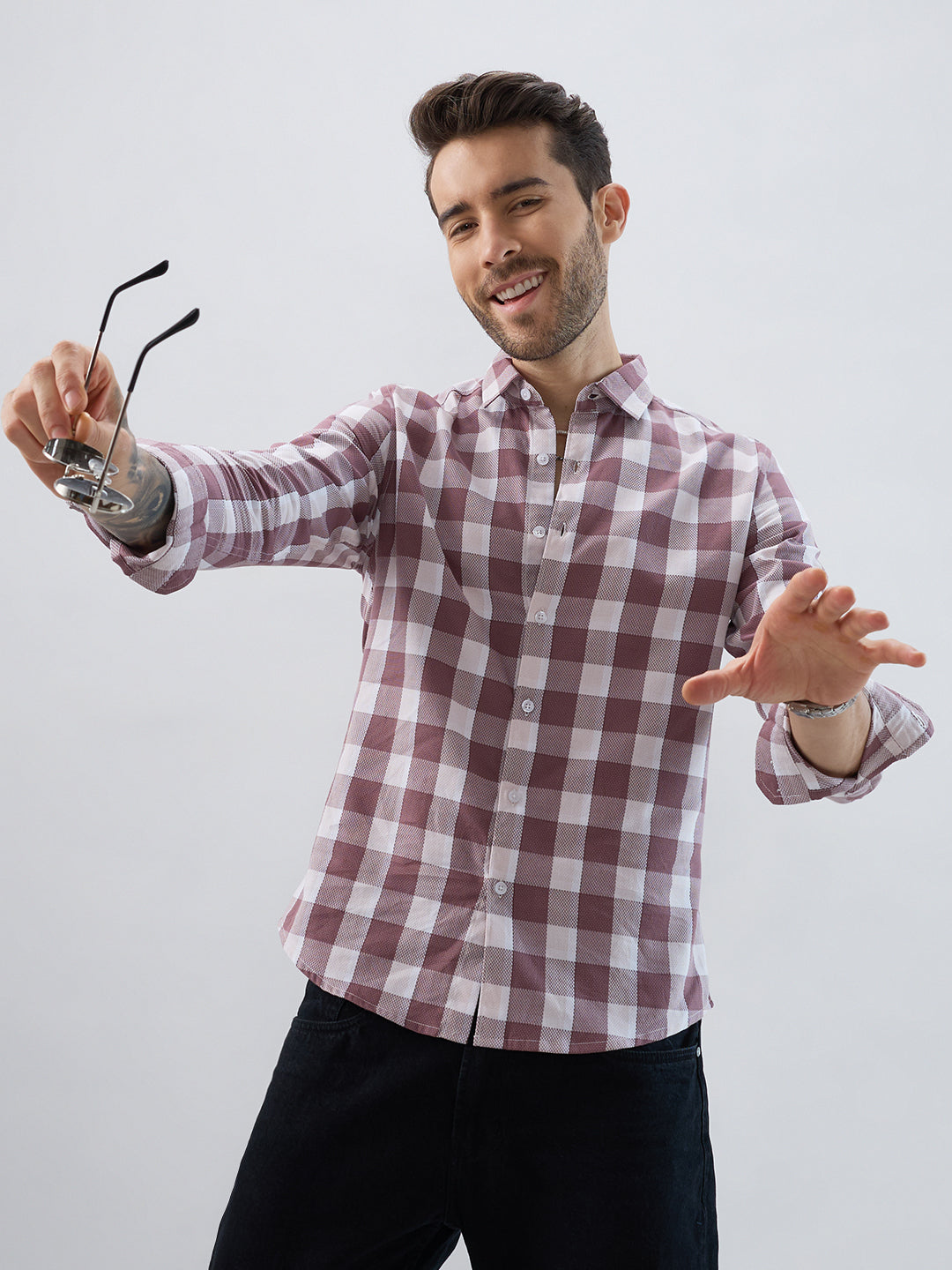 This Premium Cotton Rosewood Pink Box Checked Shirt features a classic box check pattern in a warm rosewood pink shade. Made from soft, breathable cotton, it ensures all-day comfort. Its timeless design makes it a versatile choice for casual and smart-casual looks.