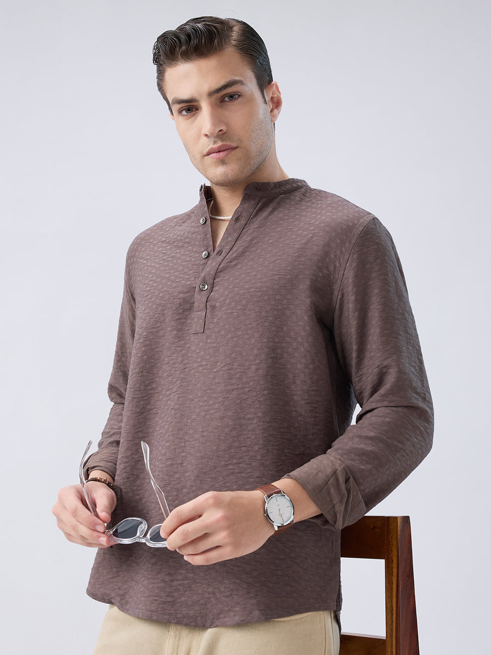 Elevate your style with this Refined Bark Brown Textured Kurta. Made from premium textured fabric, it combines comfort with a clean, modern look. The design and Mandarin collar make it a versatile choice for festive occasions or casual evenings, pair it with beige or off-white trousers for a balanced, polished outfit