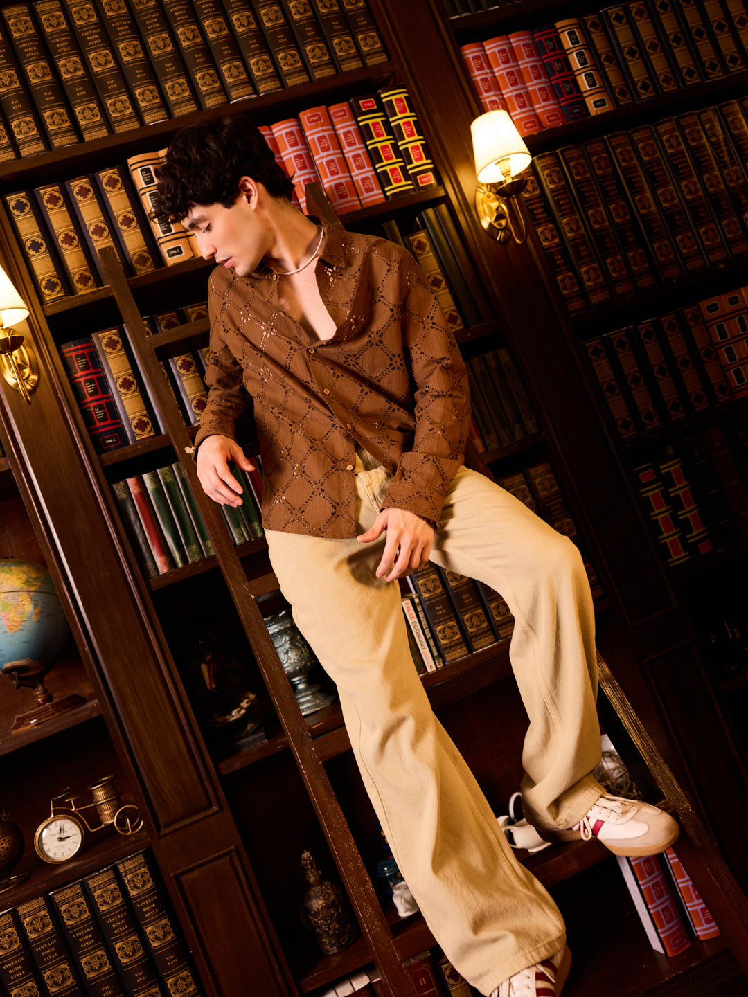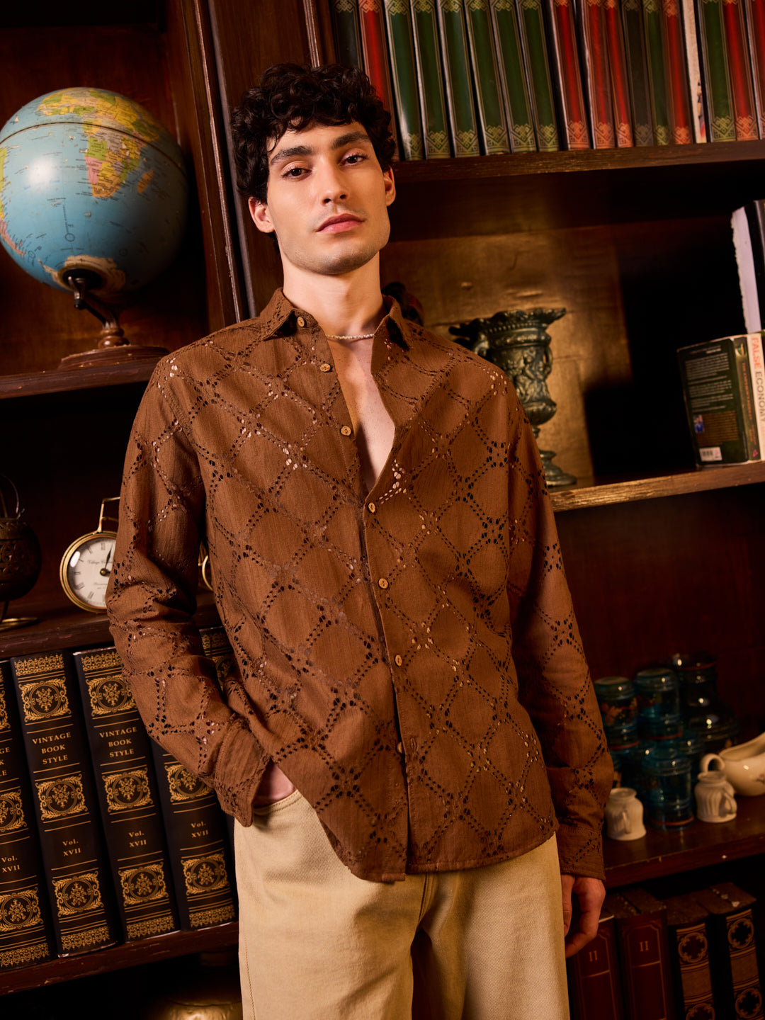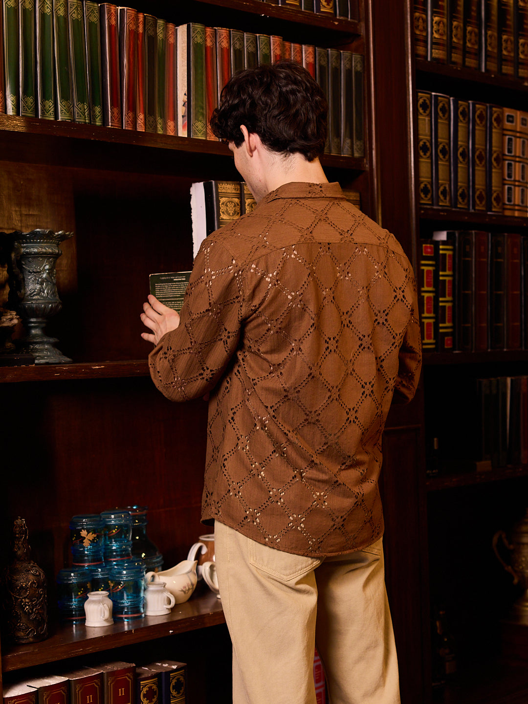 Turn heads with our Russet Brown Crochet Full-Sleeve Shirt! Unique, elegant, and crafted for a bold yet sophisticated style statement.