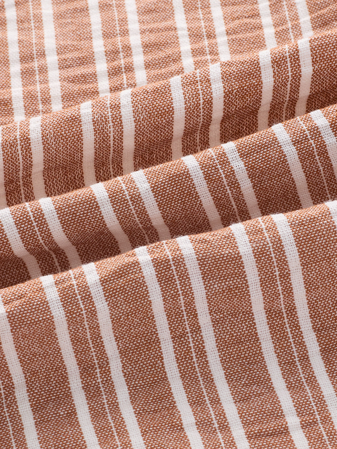This Russet Brown Striped Crinkled Boxy-Fit Crop Shirt blends earthy tones with modern texture. Featuring clean stripes over a rich russet brown base, the crinkled fabric adds depth and character. The boxy cropped silhouette ensures a relaxed yet statement-making look for everyday wear.