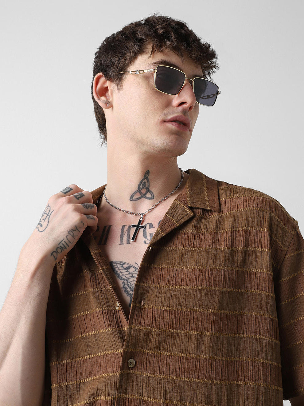 Sepia Dobby Striped Notch Collar Oversized Shirt