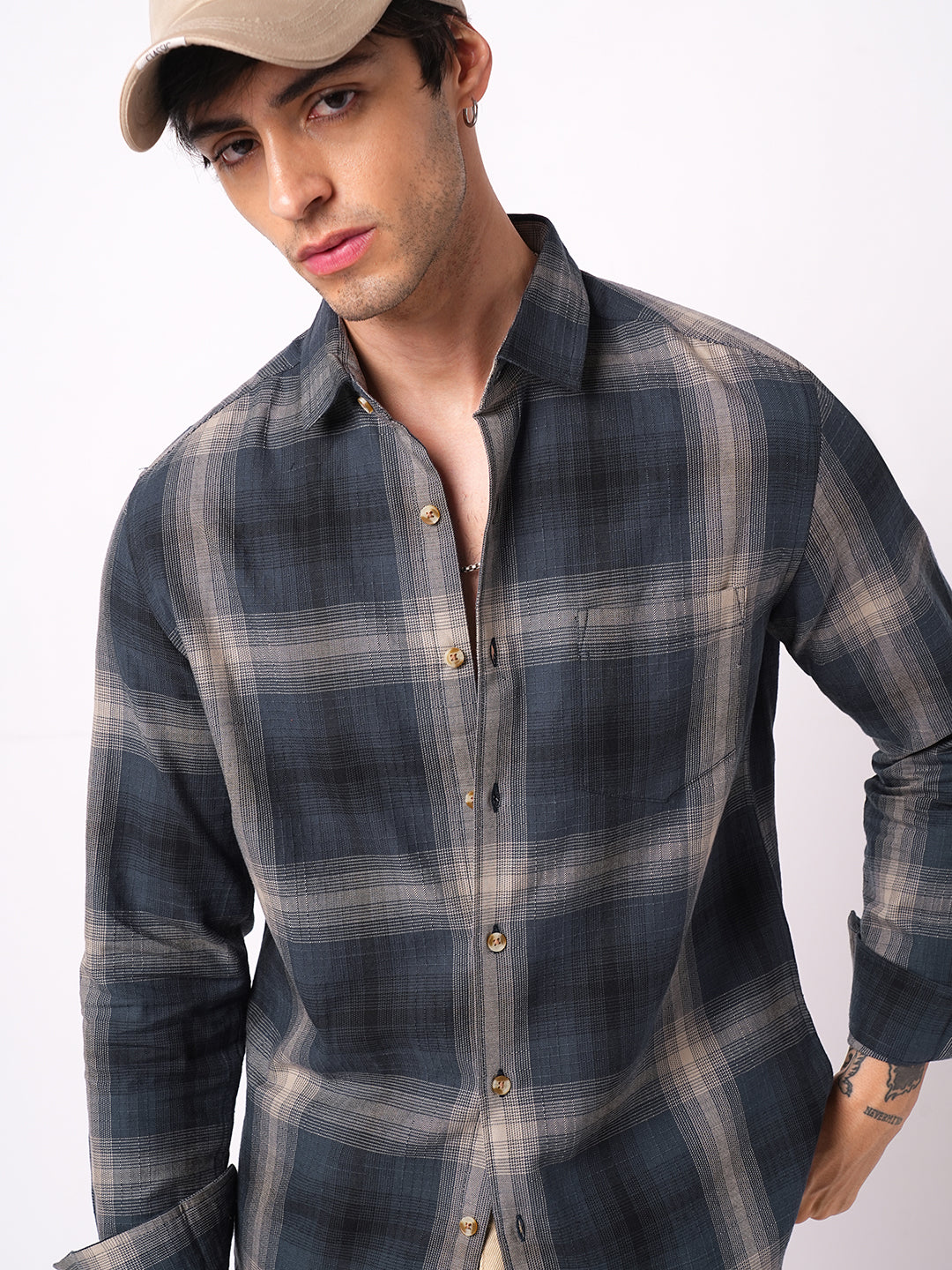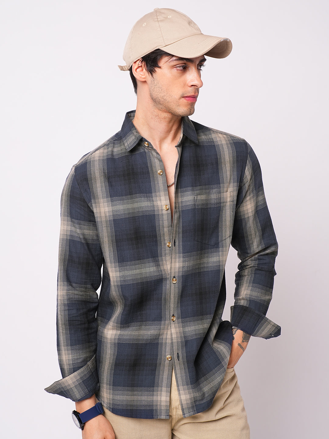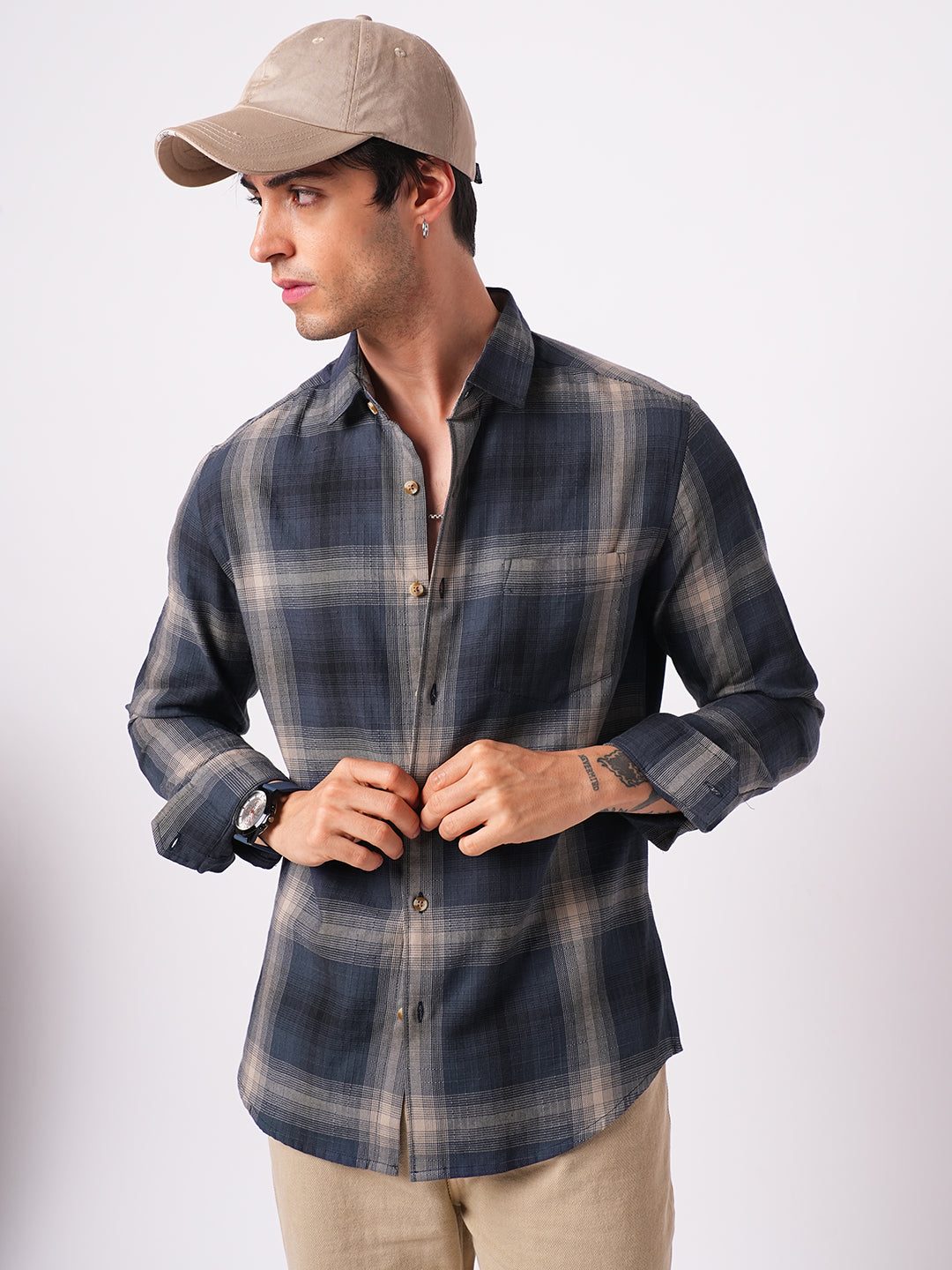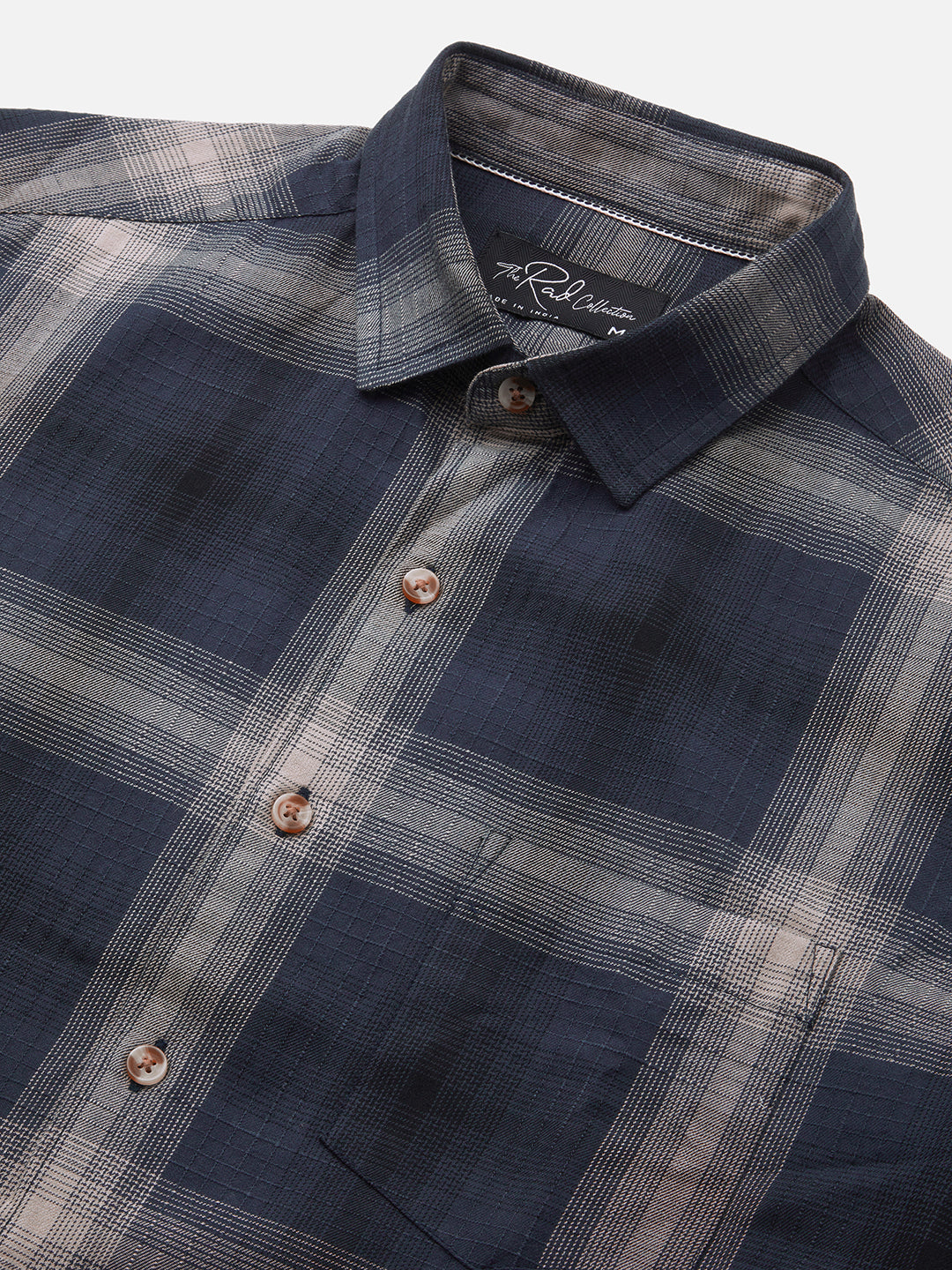 Stand out with this Premium Cotton Spiffy Space Blue Box Checks Textured Shirt, featuring a bold checkered pattern in striking shades of blue. Crafted from soft, breathable cotton, this shirt delivers all-day comfort with a sharp, modern fit. Perfect for casual Fridays, brunches, or evening outing, it's your go-to for effortless smart-casual style.