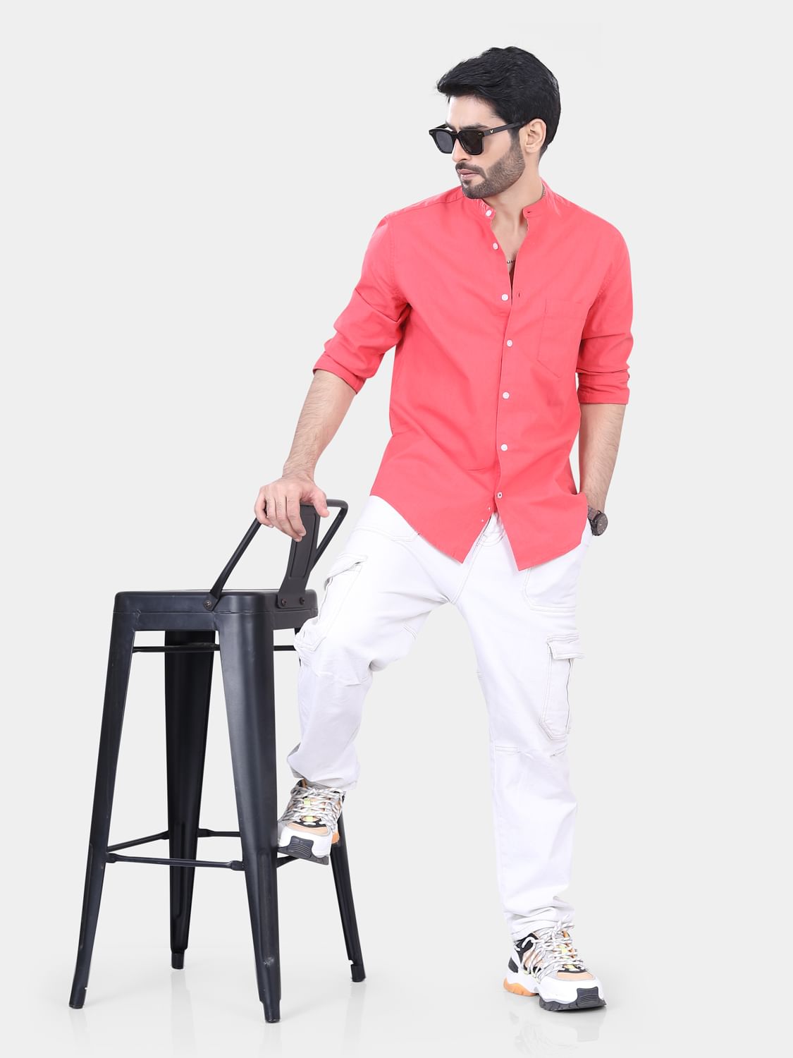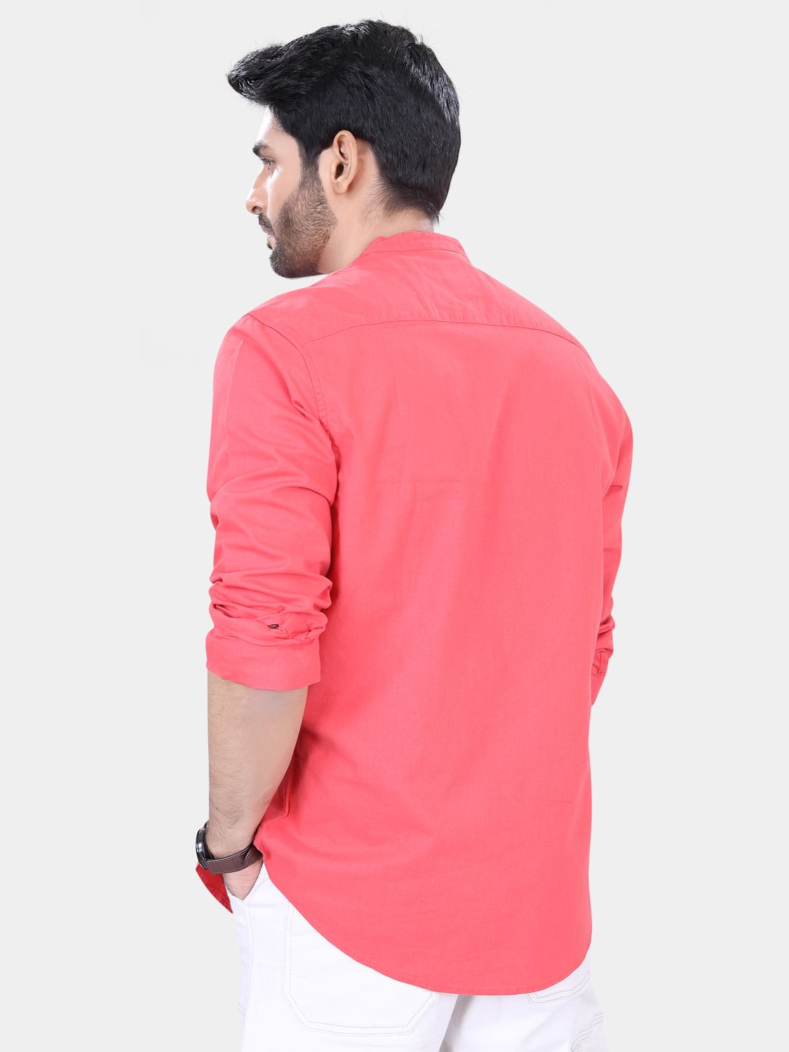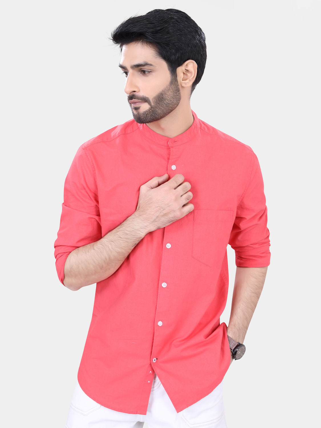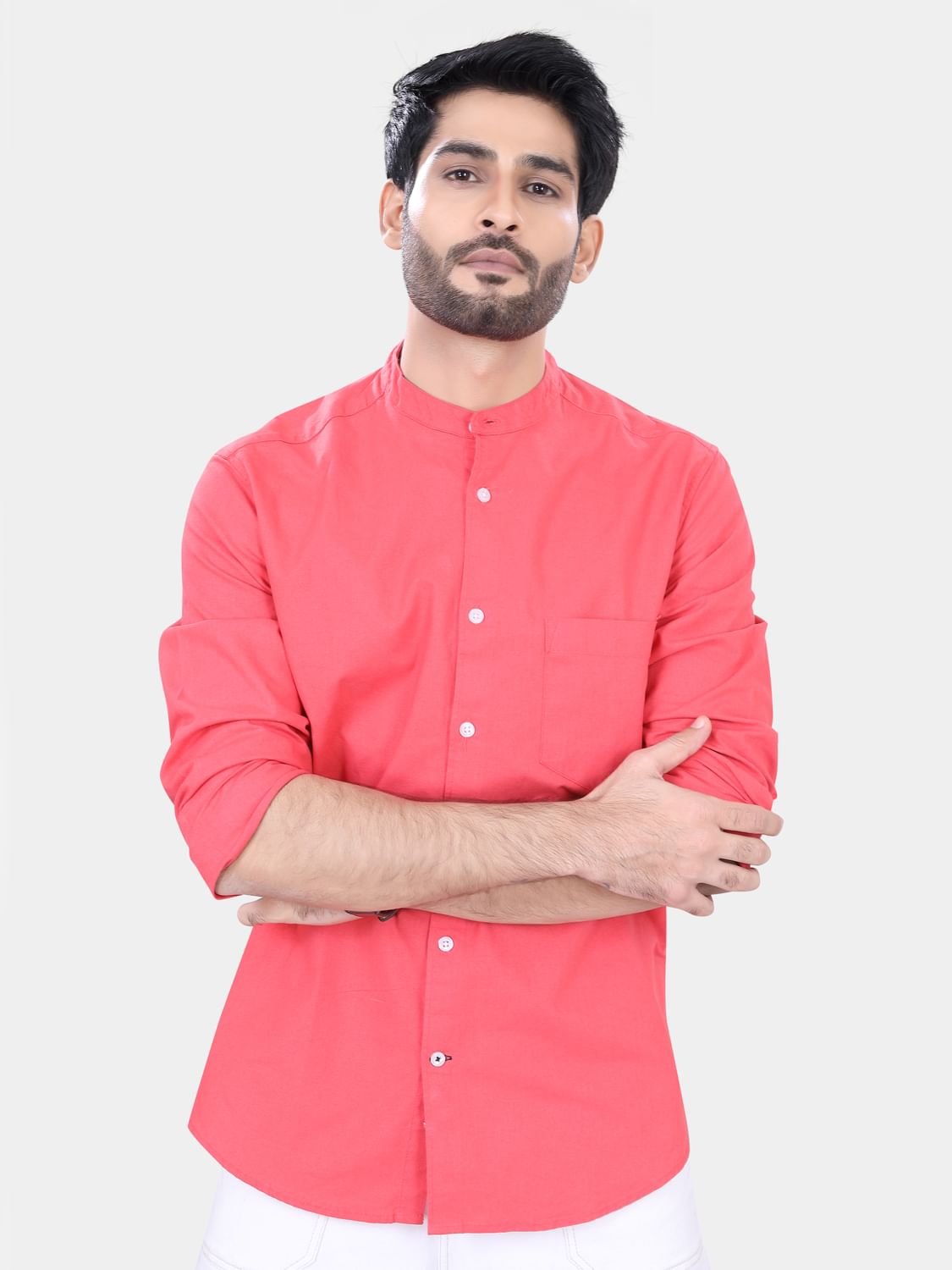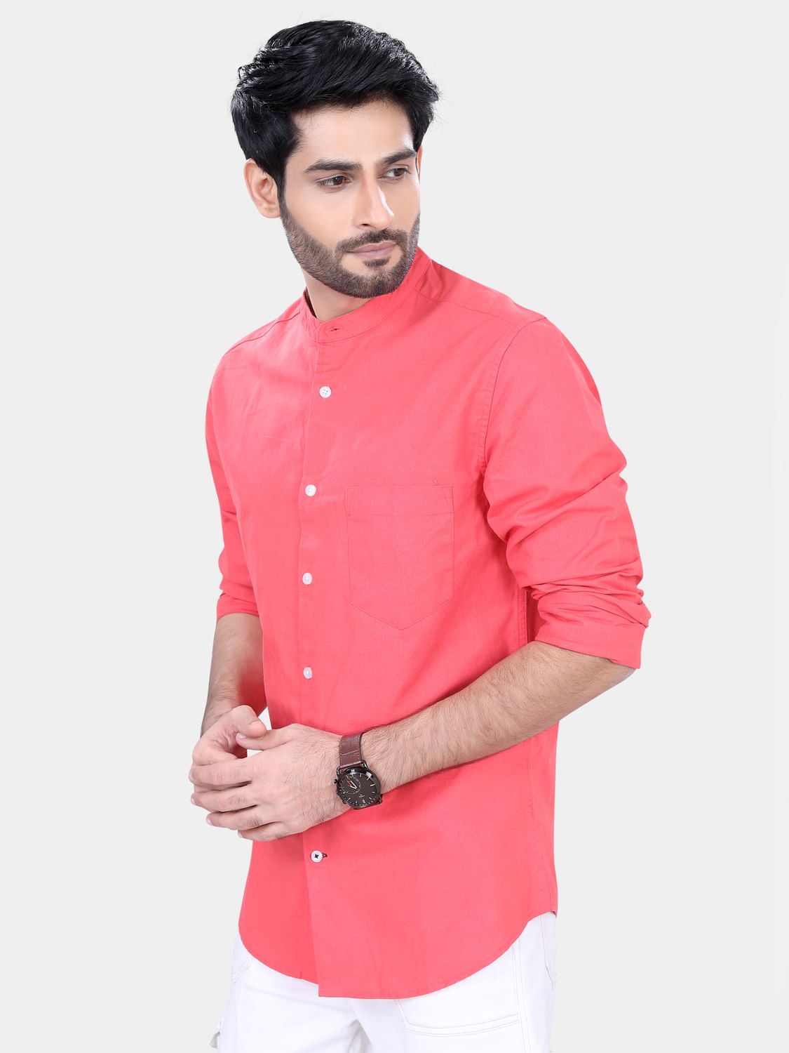 This Coral Solid shirt, has a mandarin collar, button placket, 1 patch pocket, long regular sleeves, curved hem
