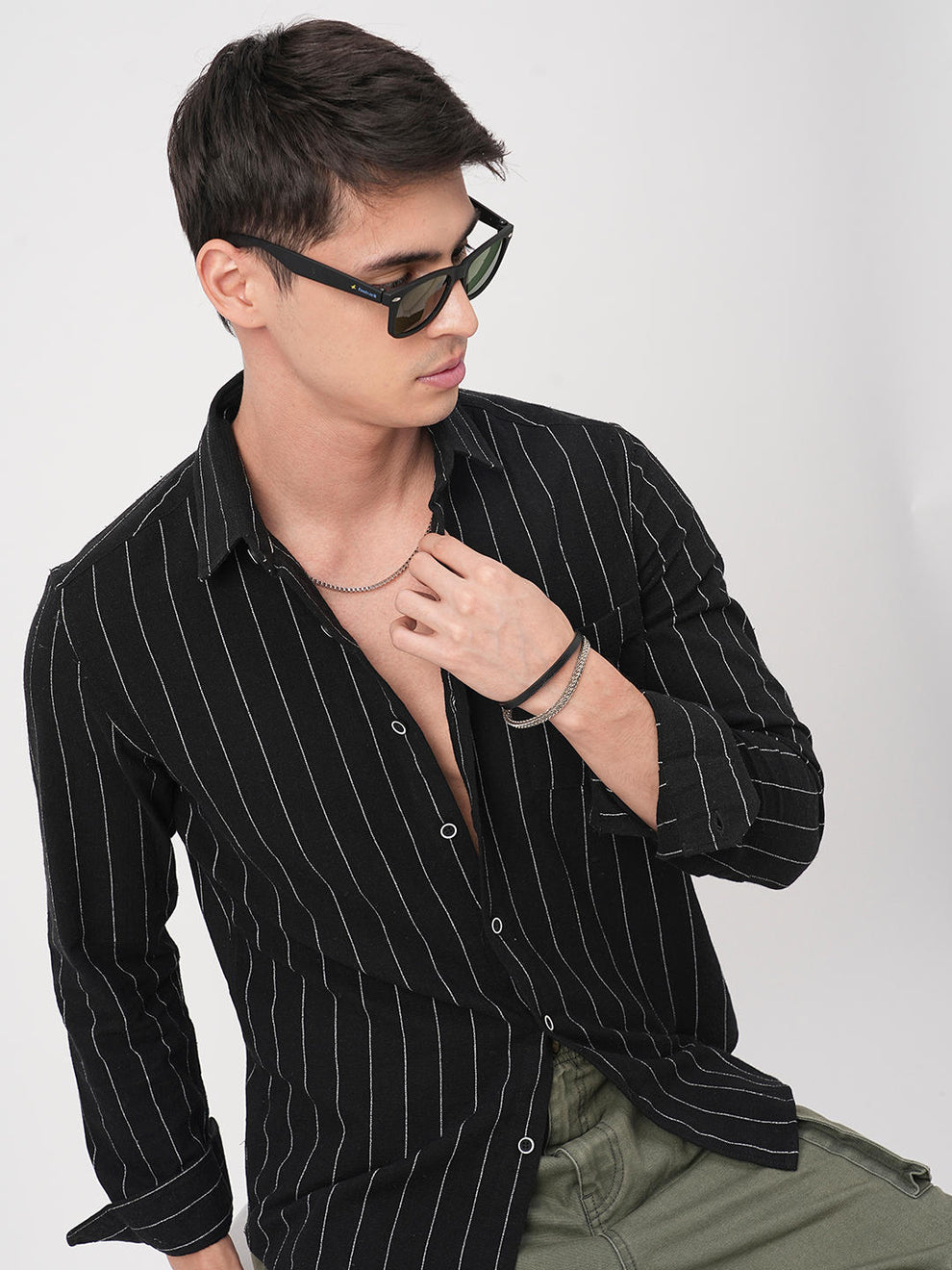 Stand out with our Black Striped Shirt from VASTRADO, featuring vertical stripes for a slimming effect. The premium fabric, full sleeves, and slim fit ensure all-day comfort. Style with light colour jeans and sneakers/boots for a polished look at outdoor events or casual Fridays.