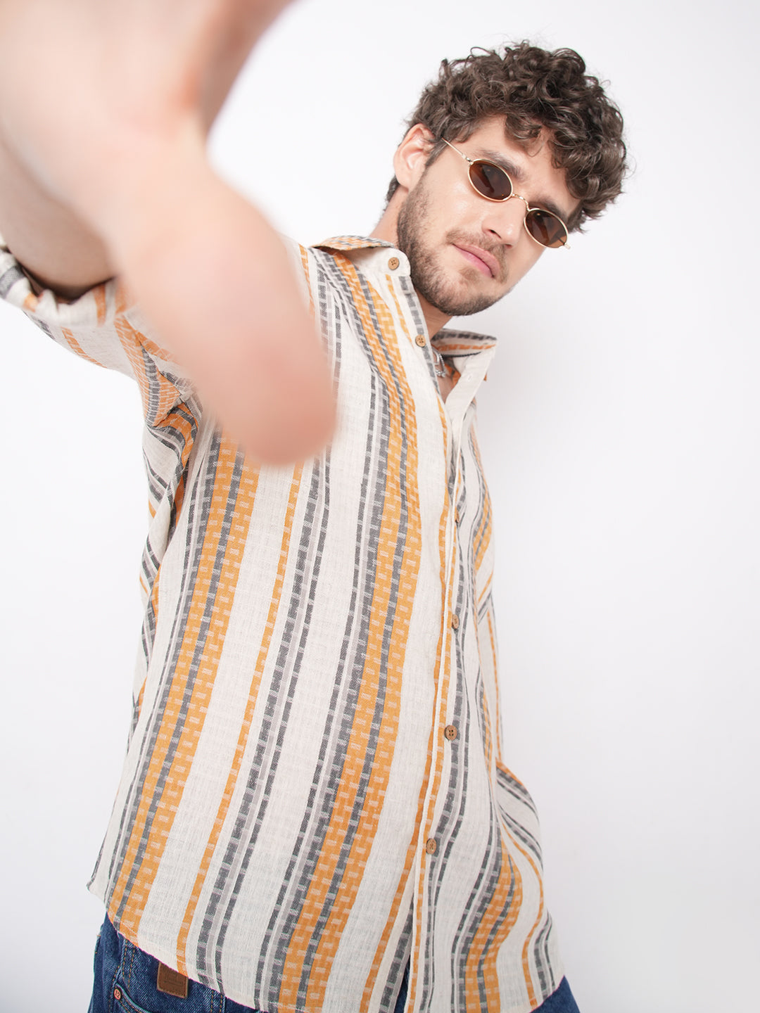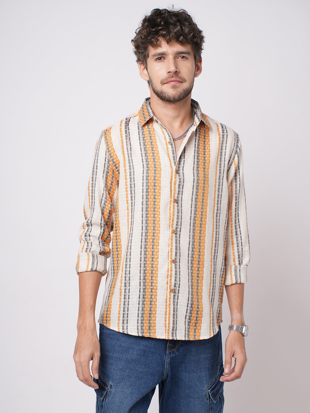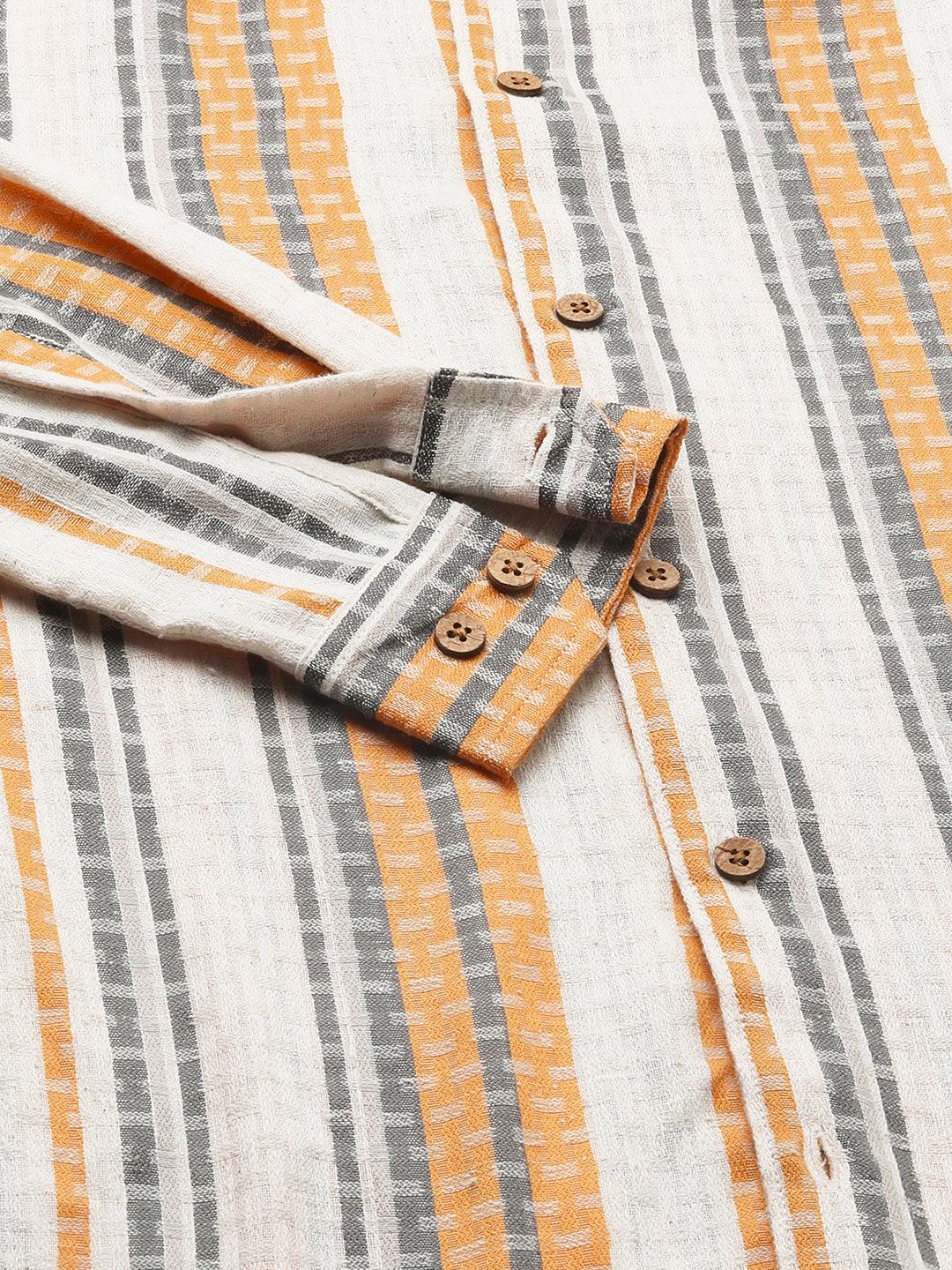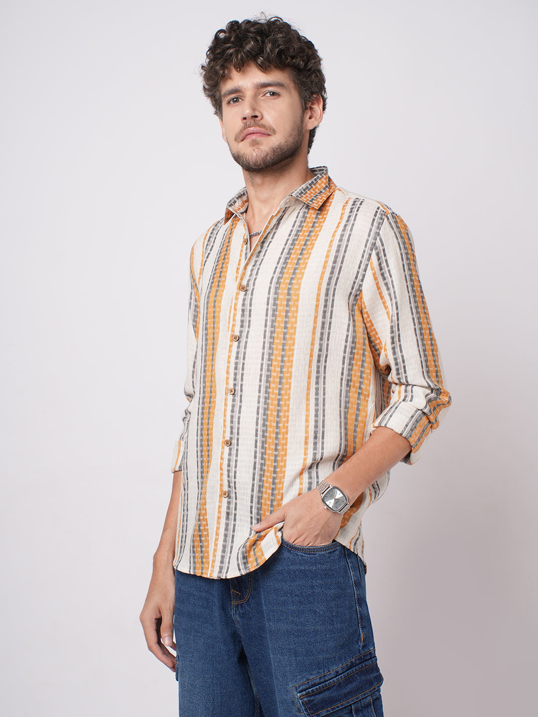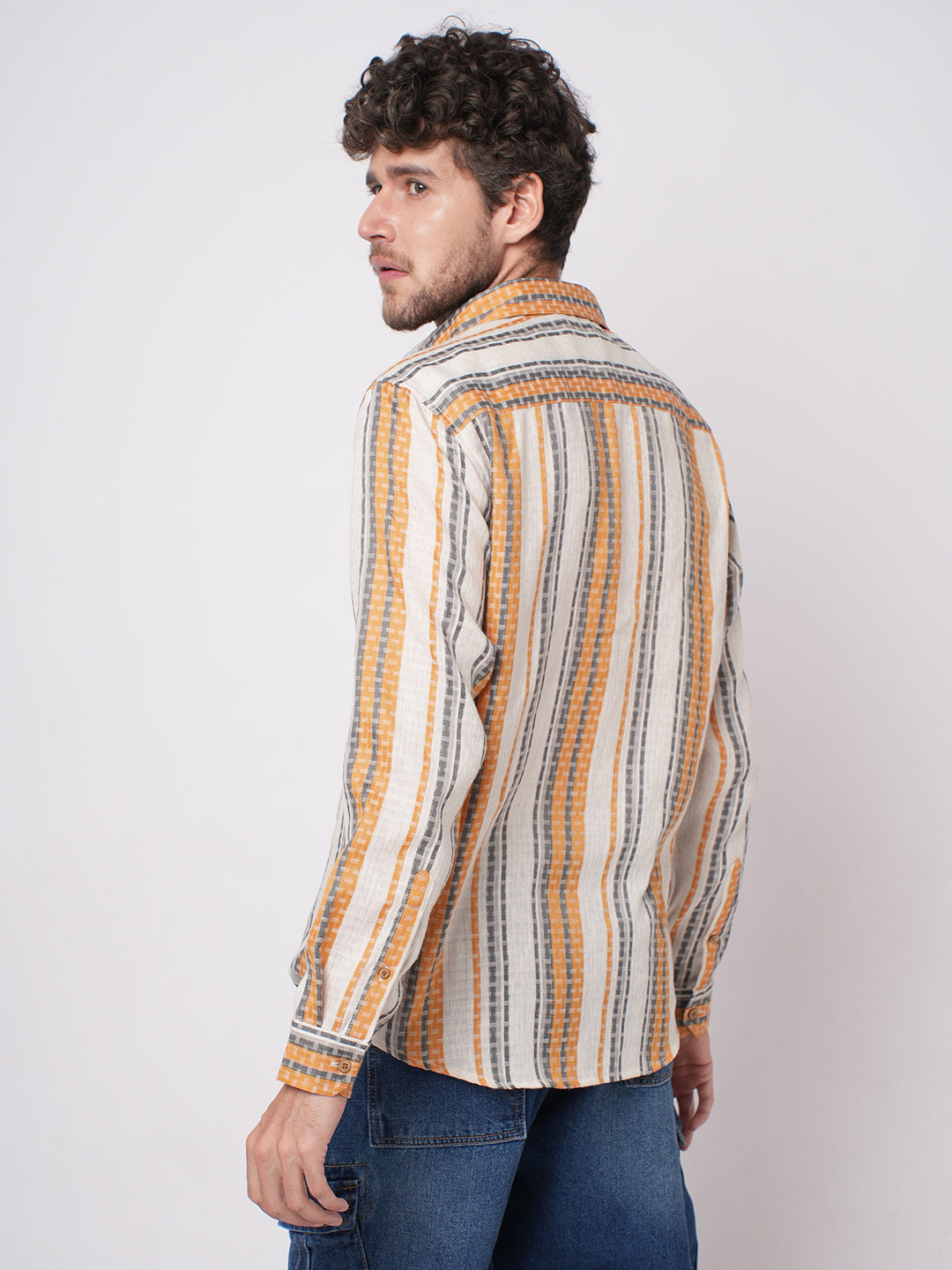 Bring class to your style with this Stylish Multicolor Dobby Striped Shirt. Its dobby weave enhances durability and adds depth to the striped design, while the multi-color palette keeps it upbeat and versatile. A statement piece for those who like subtle detail with a playful twist.