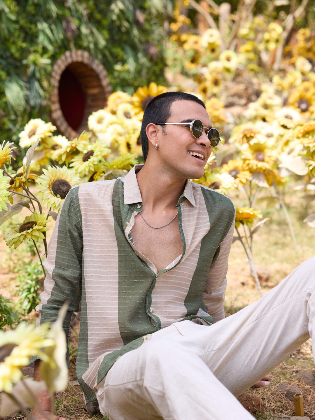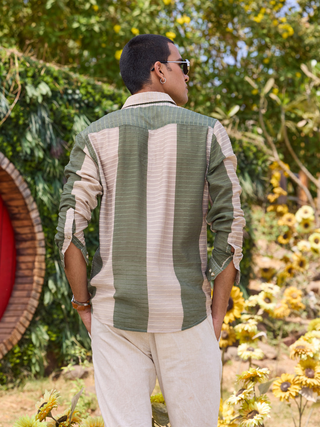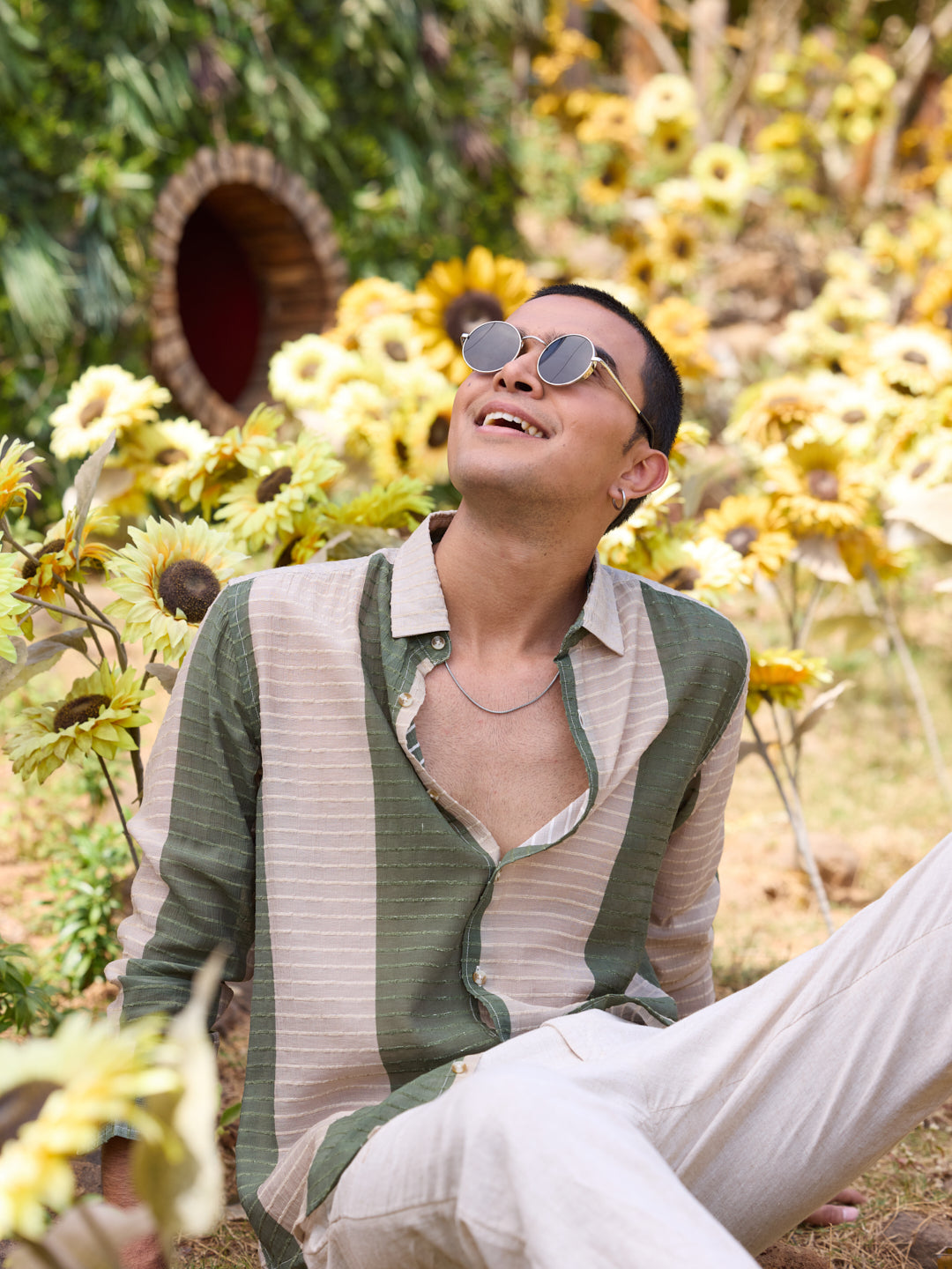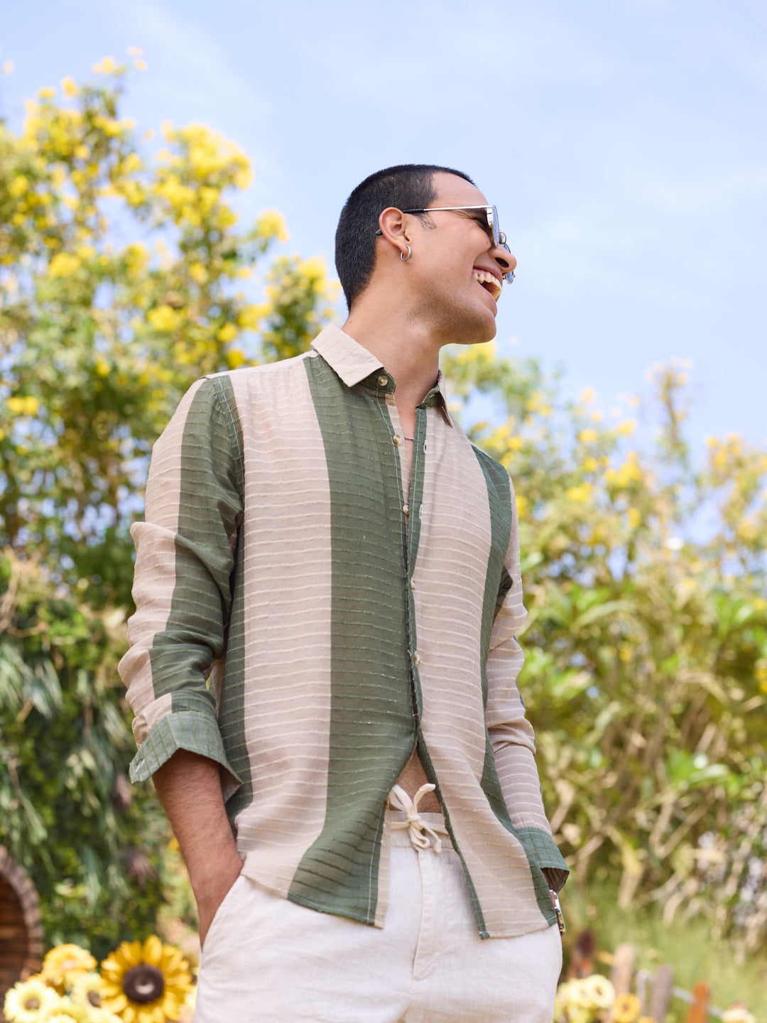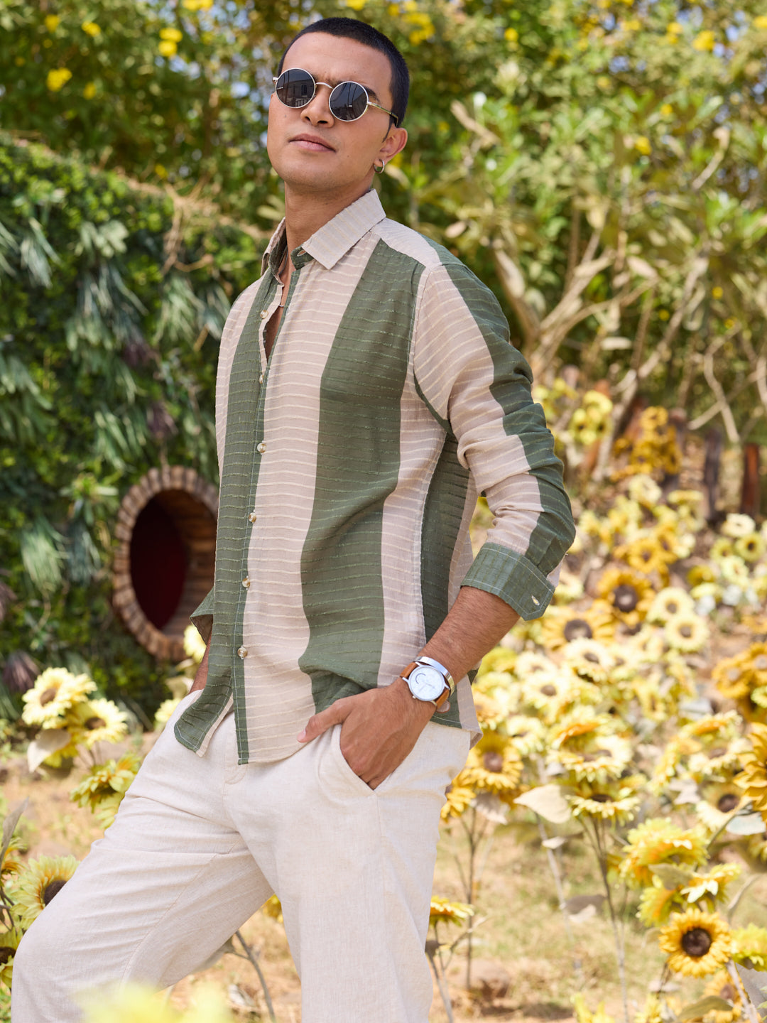 Suave Olive & Beige Horizontal Striped Dobby Shirt