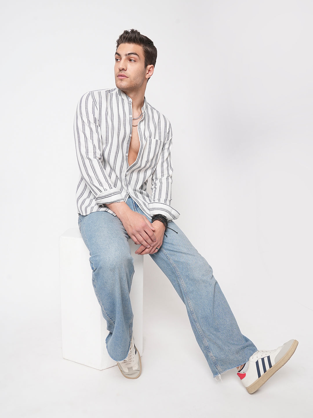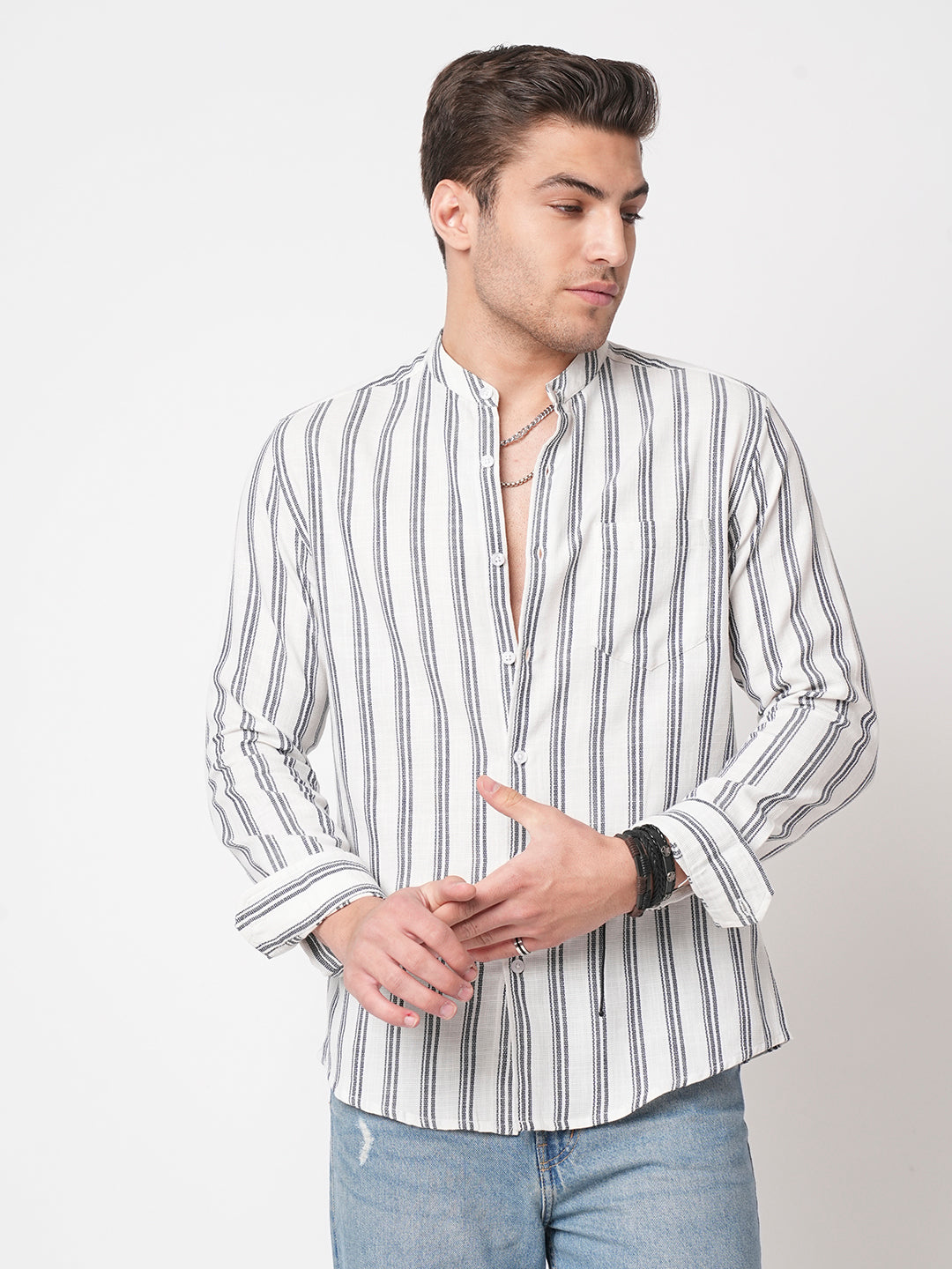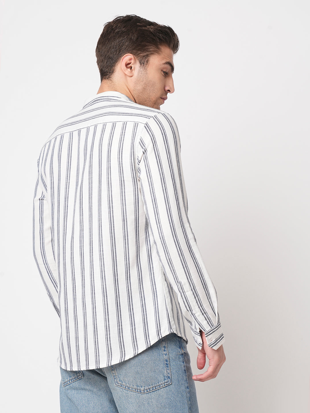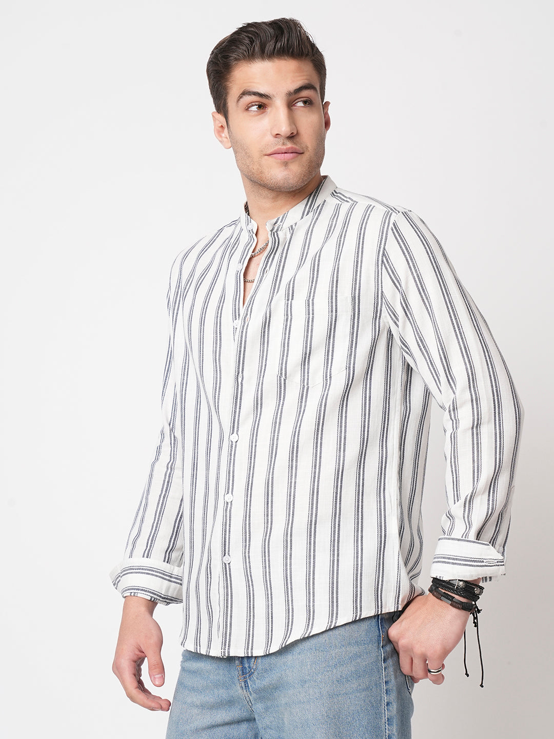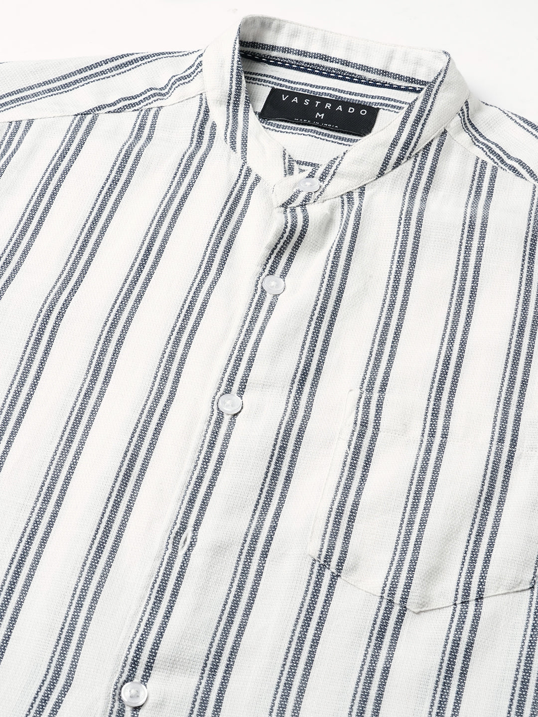 White & Navy Vertical Striped Mandarin Shirt