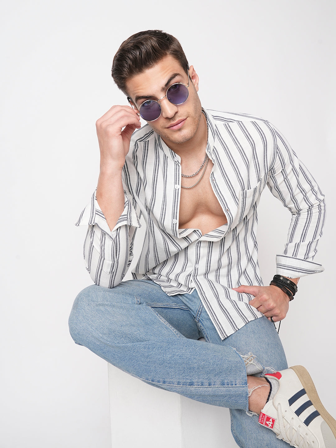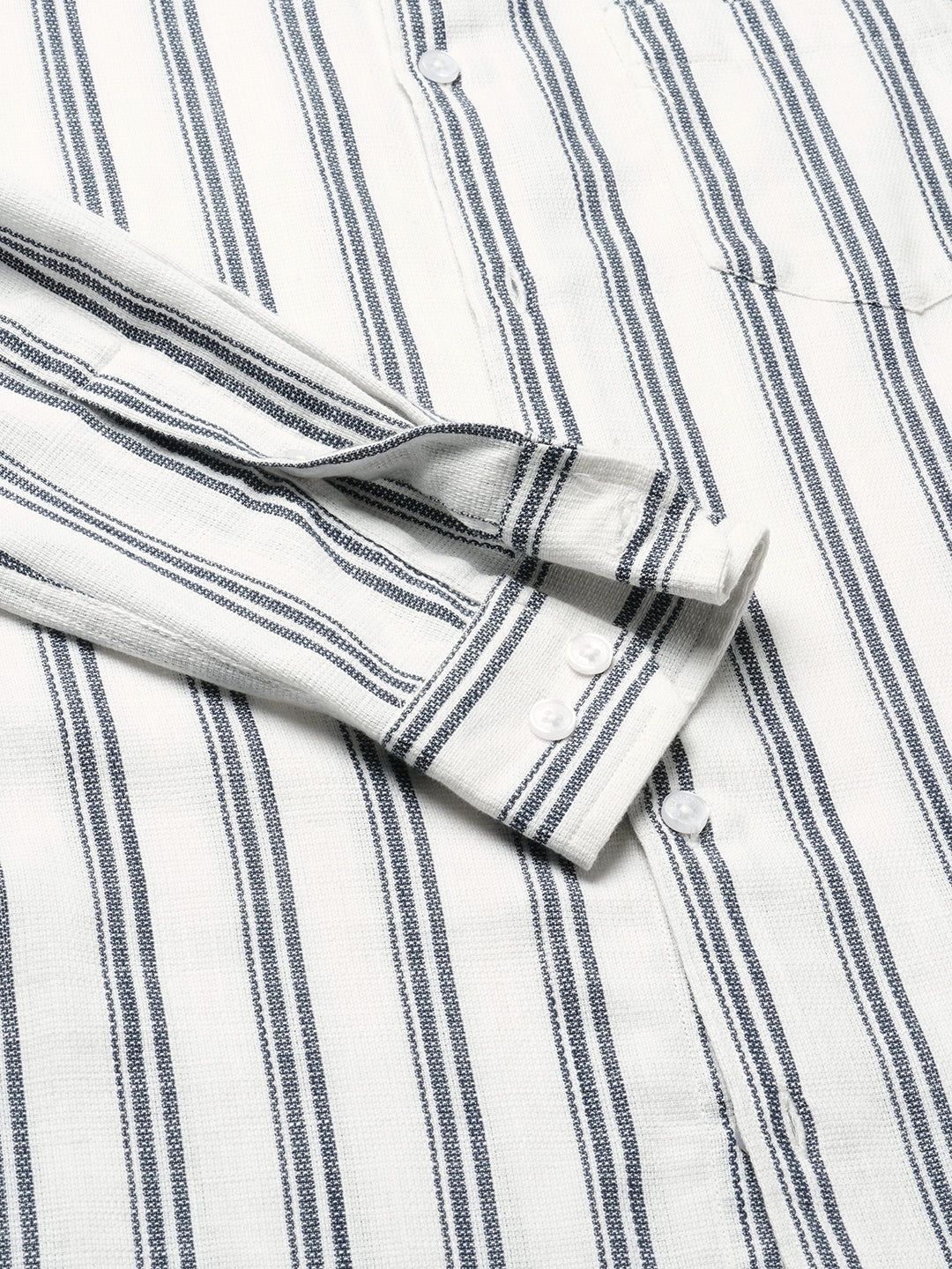Make a bold impression with our White & Navy Striped Full-Sleeve Shirt! Sleek, stylish, and effortlessly versatile, perfect for upping your fashion game, day or night.